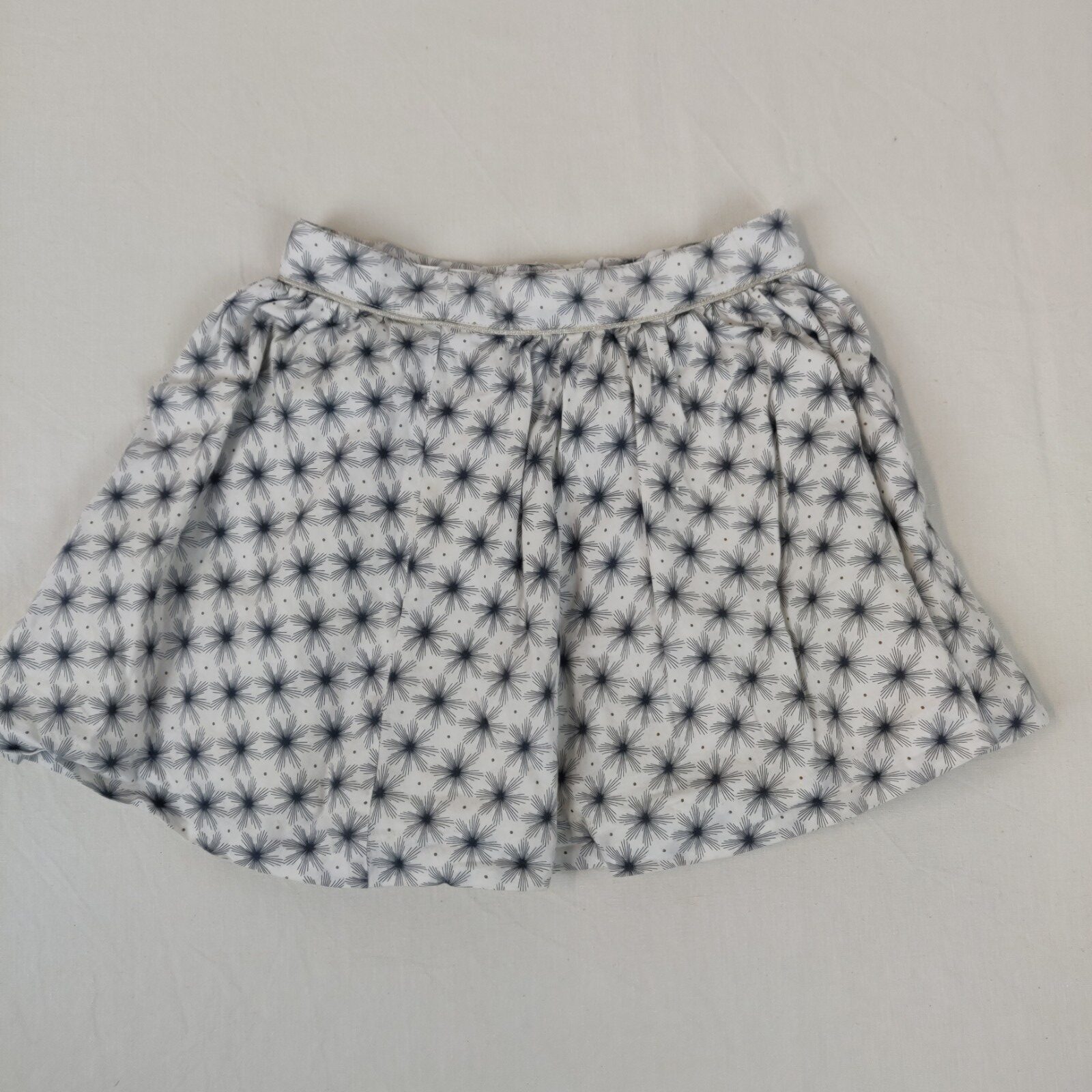 Autres commentaires : Jupe doublée – blanc à motifs floraux gris foncé. Taille ajustable et soulignée d’un fin ruban argenté. Ouverture latérale zippée. Petite tâche rouge à l’arrière. Niveau réduit de fraise à myrtille.