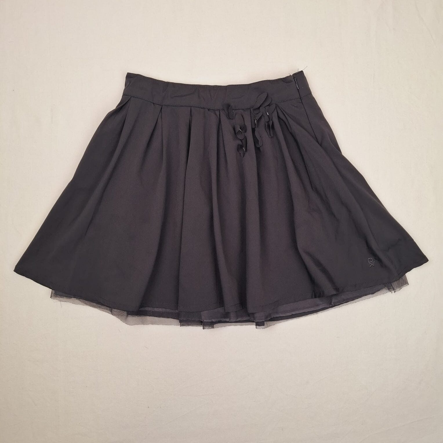 Autres commentaires : Jupe patineuse satinée gris foncé, petits papillons en relief dans le même tissu, fixés avec des fils argenté devant sur la partie gauche, double jupon, un en tulle et un en satin gris 100% polyester, taille ajustable par élastique intérieur, fermeture latérale par zip.