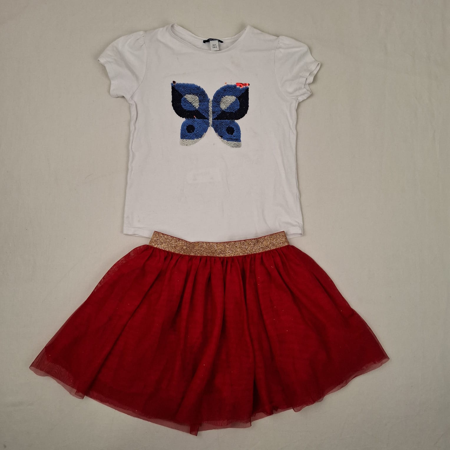 Autres commentaires : Jupe patineuse rouge, composée d’une superposition de gaze avec doublure rouge en dessous, taille élastiquée et dorée. OFFERT : – T-shirt blanc manches courtes Okaïdi, devant motif papillon en sequins bleutés et argentés, col arrondi et large.