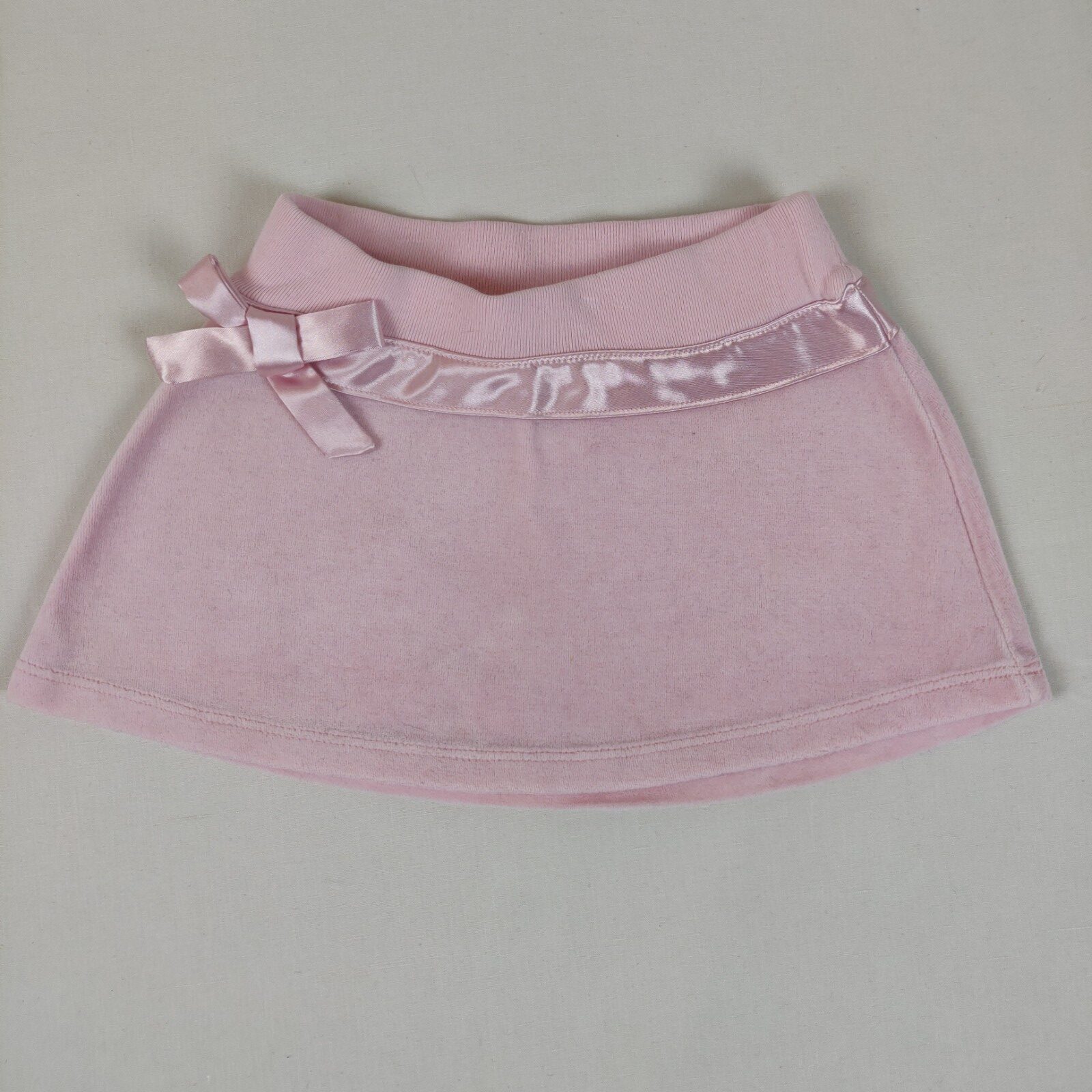 Autres commentaires : 25% polyester. Jupe en velours rose. Bandeau satiné rose avec noeud assorti soulignant la taille élastique.