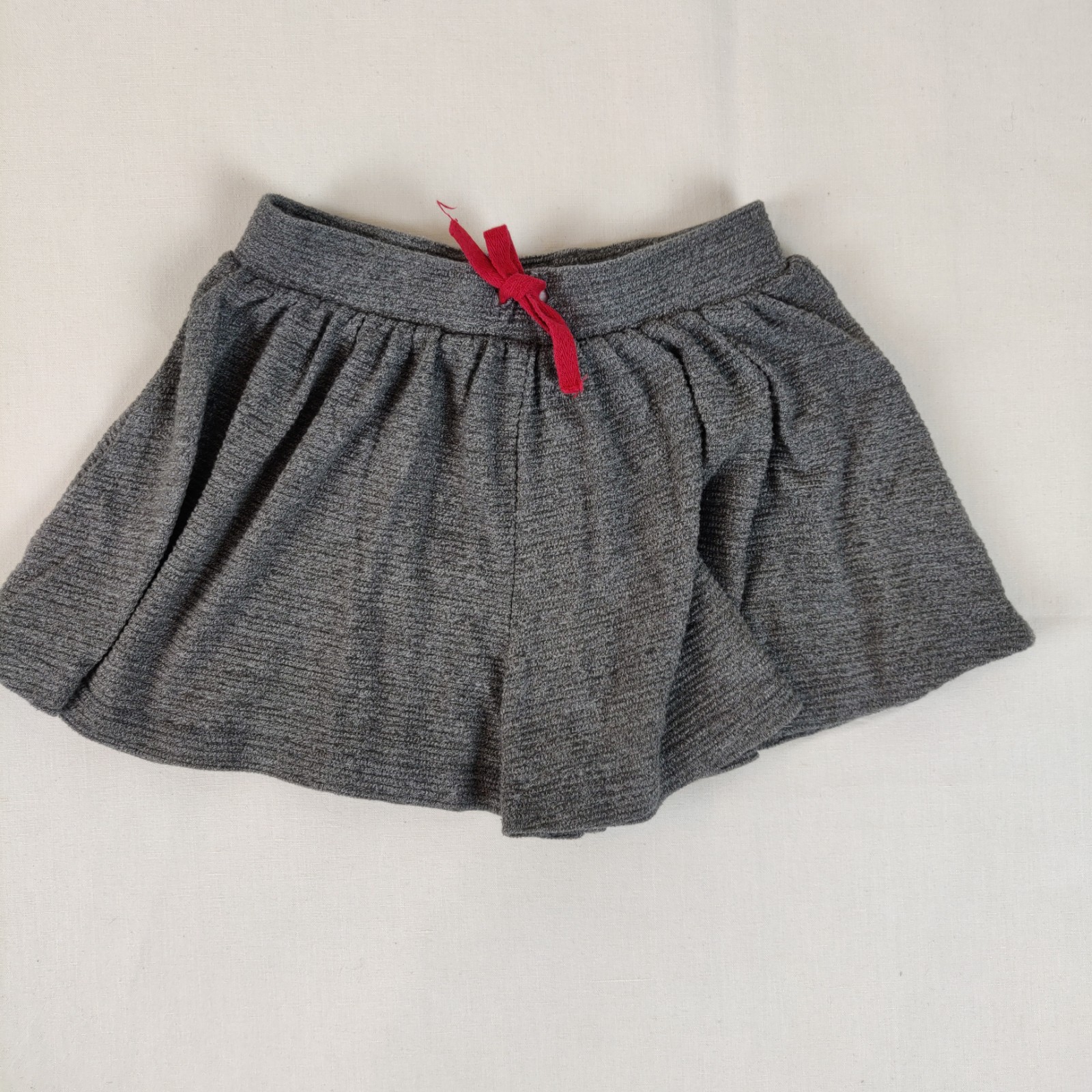 Autres commentaires : 50% polyester. Jupe-culotte en maille gris chiné, taille élastiquée et noeud rouge d’ornement.