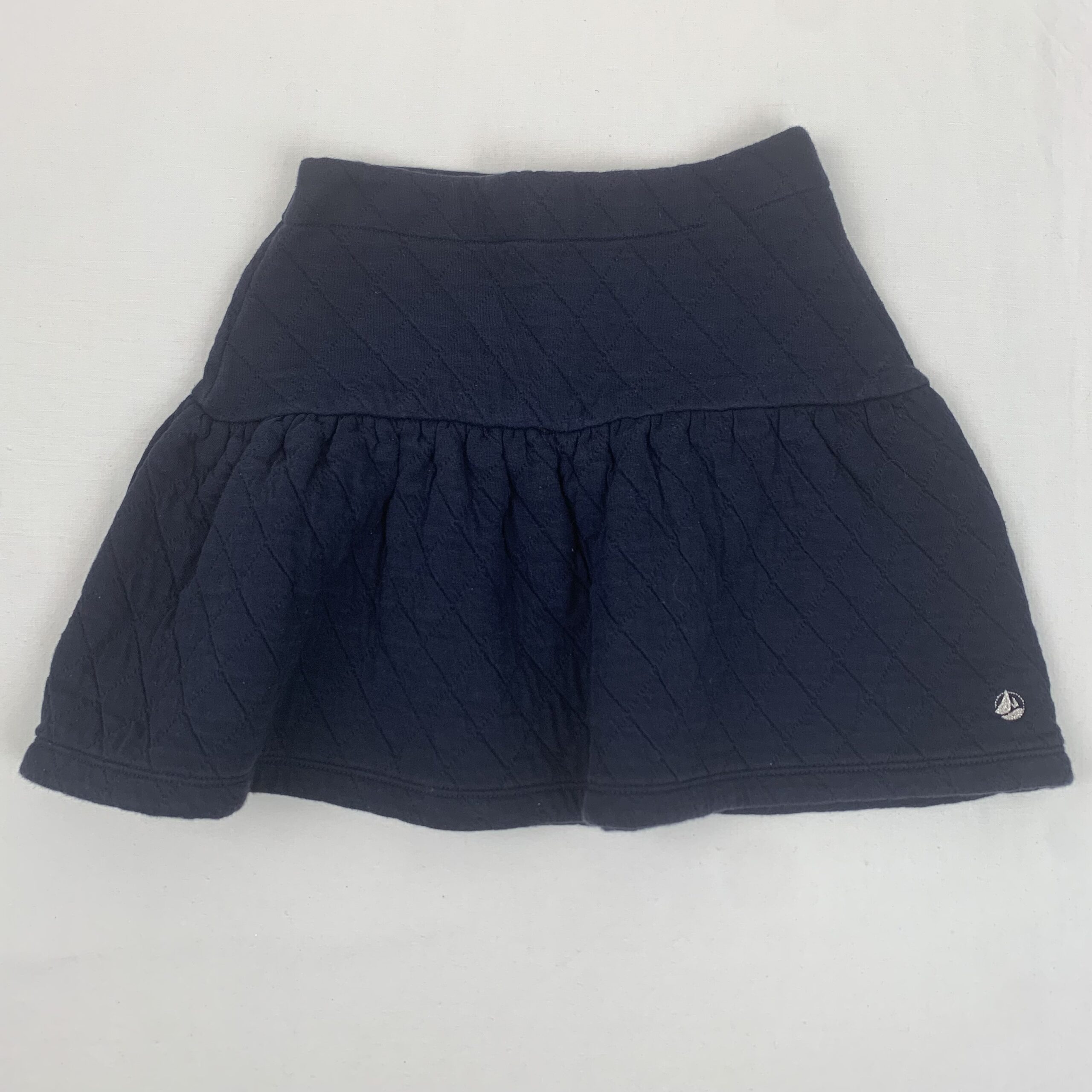Autres commentaires : Jupe Petit bateau 10A bleu foncé avec broderie logop argenté à l’avant, tissus épais