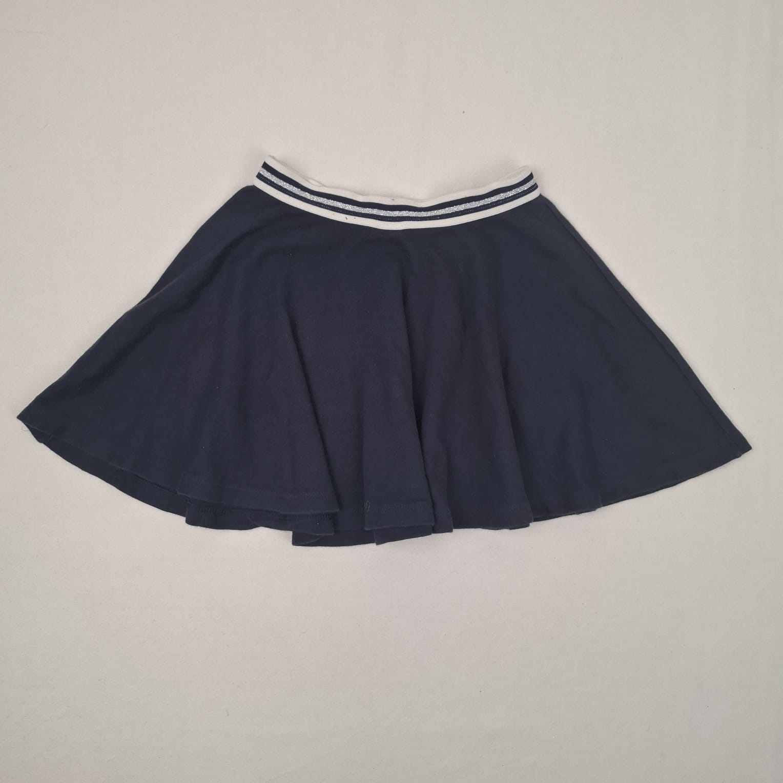 Autres commentaires : Jupe, bleu foncé, taille élastiqué avec ruban blanc et rayures bleu foncé