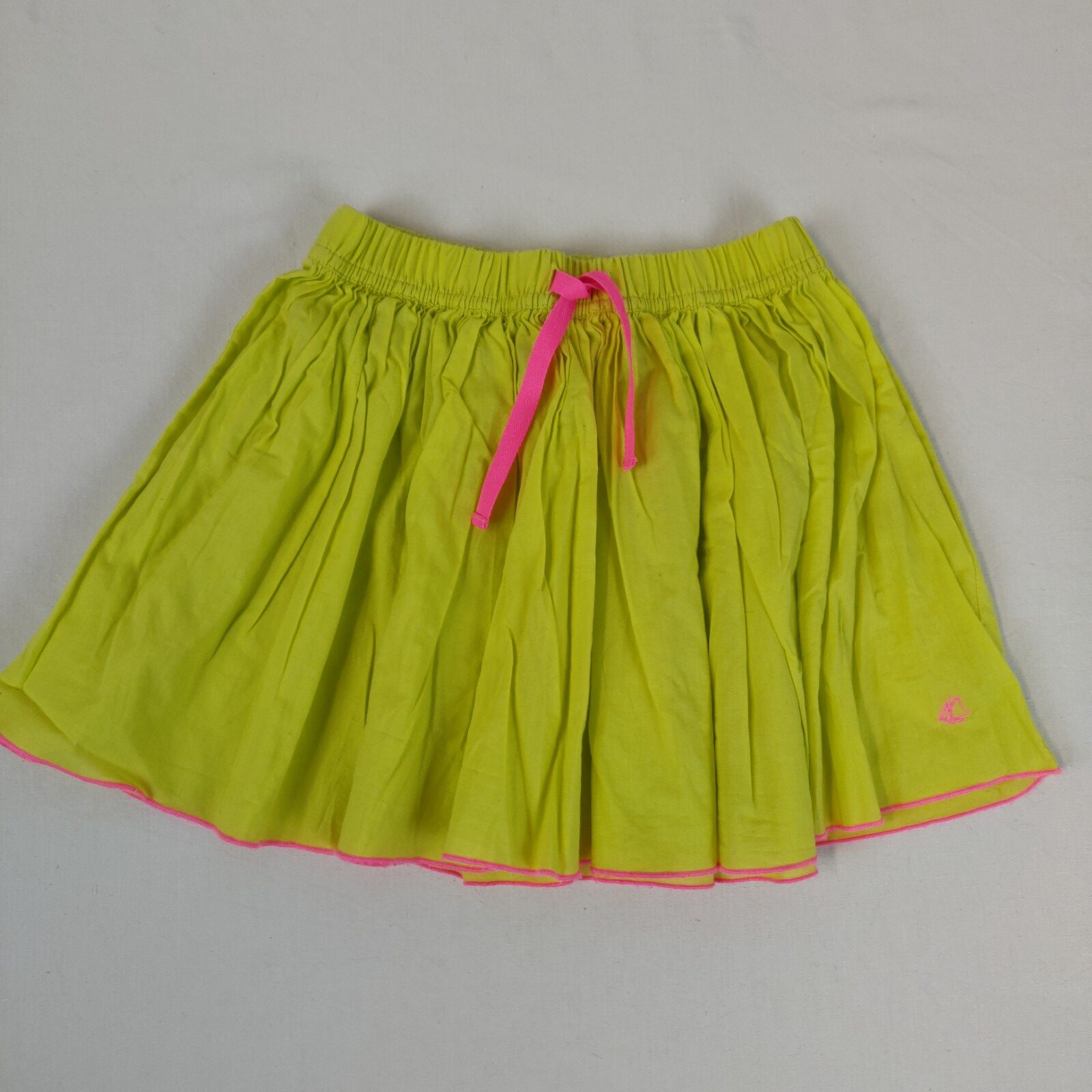 Autres commentaires : Jupe plissée -jaune-vert vitaminé. Taille élastique. Griffe voilier rose fluo au niveau du rebord de la jupe. Fin liseré rose fluo terminant la jupe.