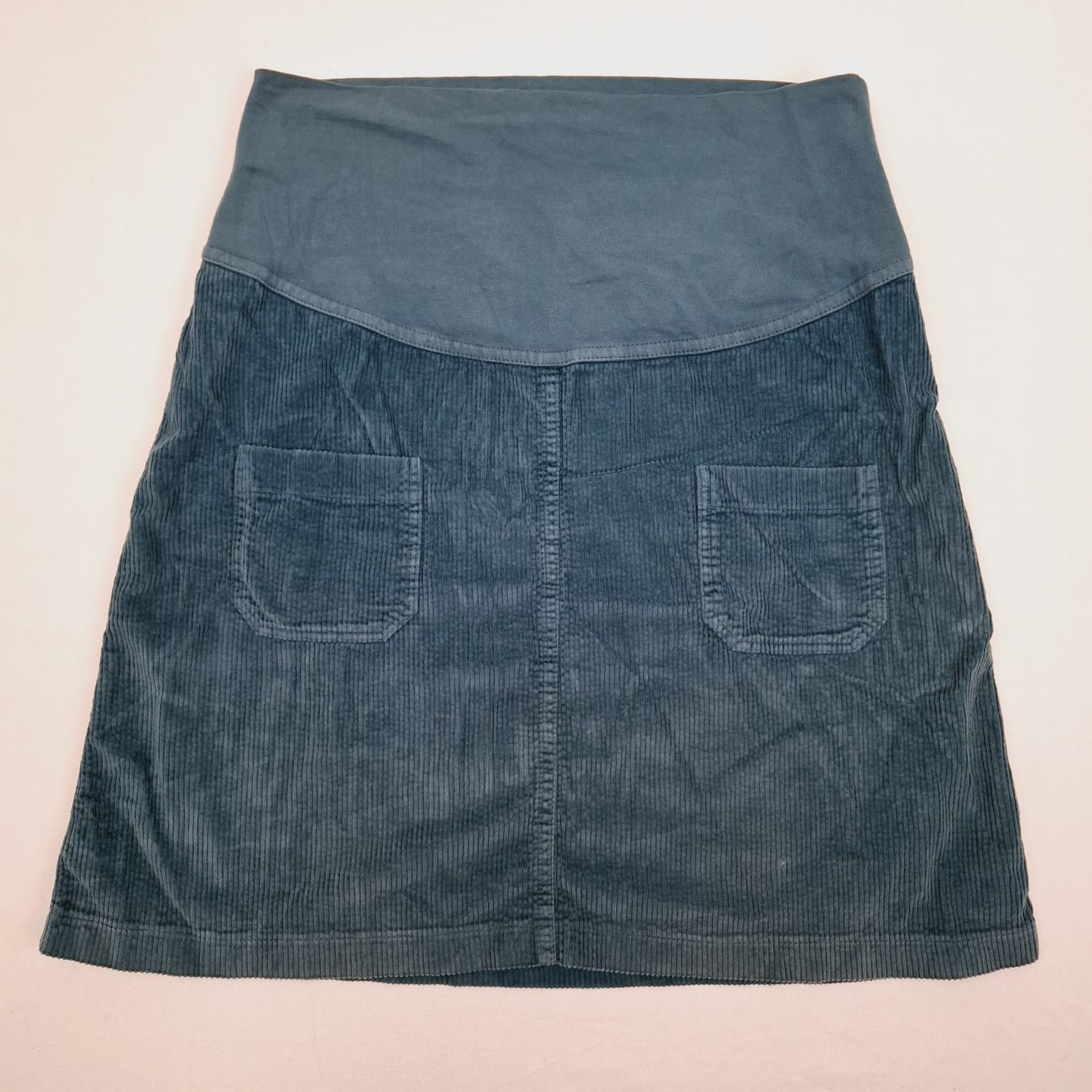 Autres commentaires : Jupe en velours côtelé vert canard, forme droite légèrement trapèze, taille élastiquée avec bandeau confort pour le ventre. Taille 38 estimée.