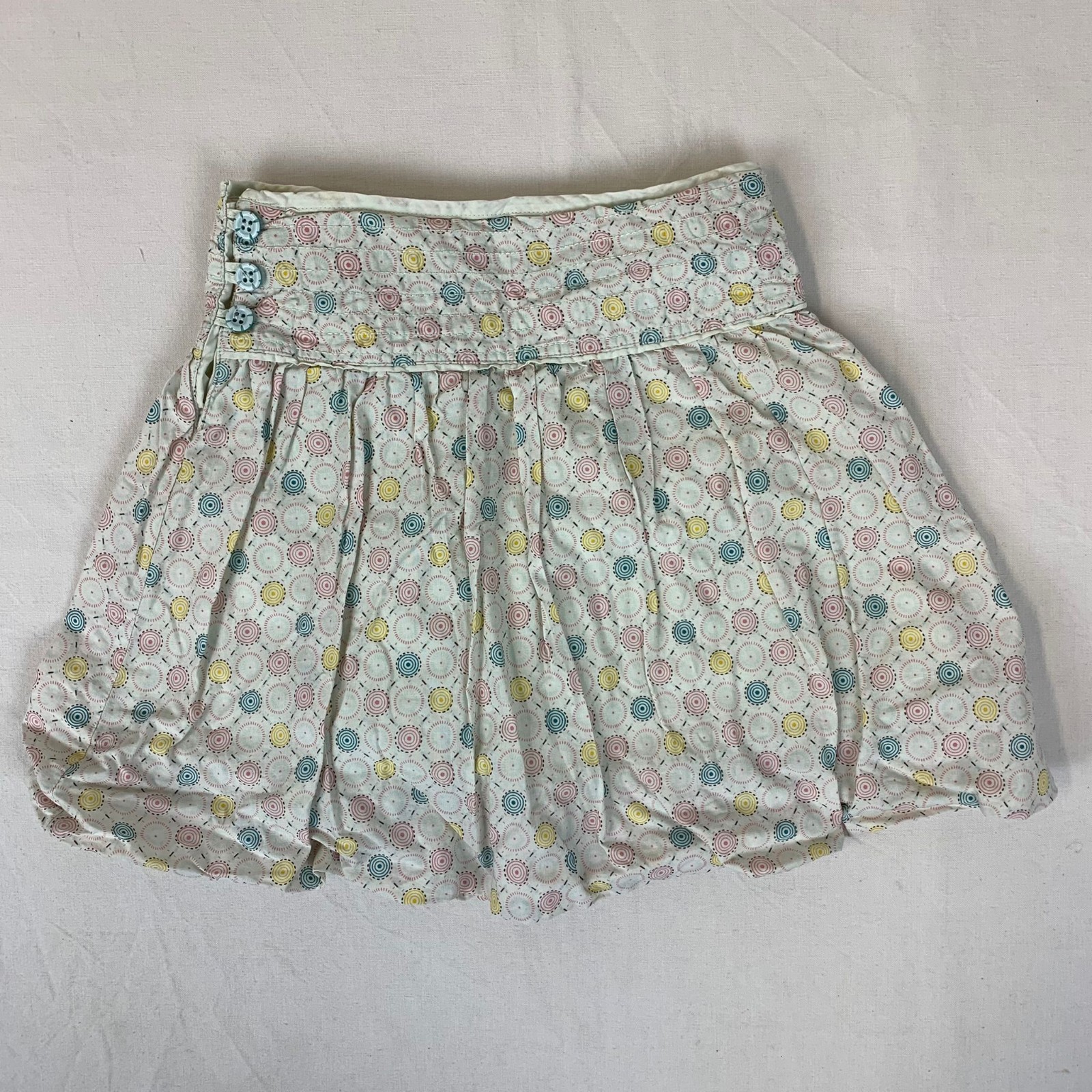 Autres commentaires : Jupe courte évasée en beige avec des motif multicolores.