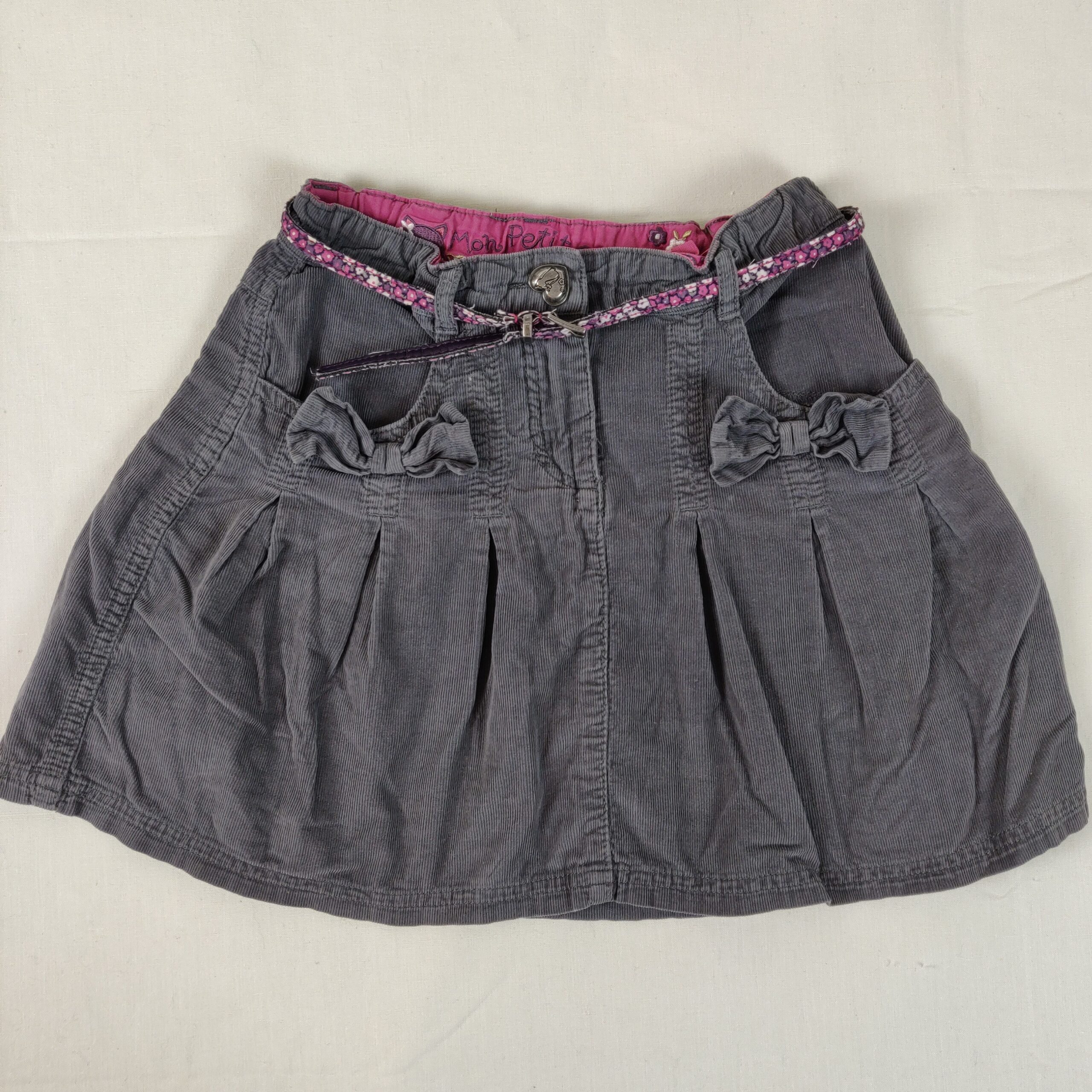 Autres commentaires : Jupe en velours côtélé grise marron glacé, avec une ceinture fine fleurie de différentes tonalités de rose. Noeud en relief au noiveau de chaque poche devant. Fermeture deavant par un bouton en métal en forme de coeur avec un chat gravé et fermeture éclair.