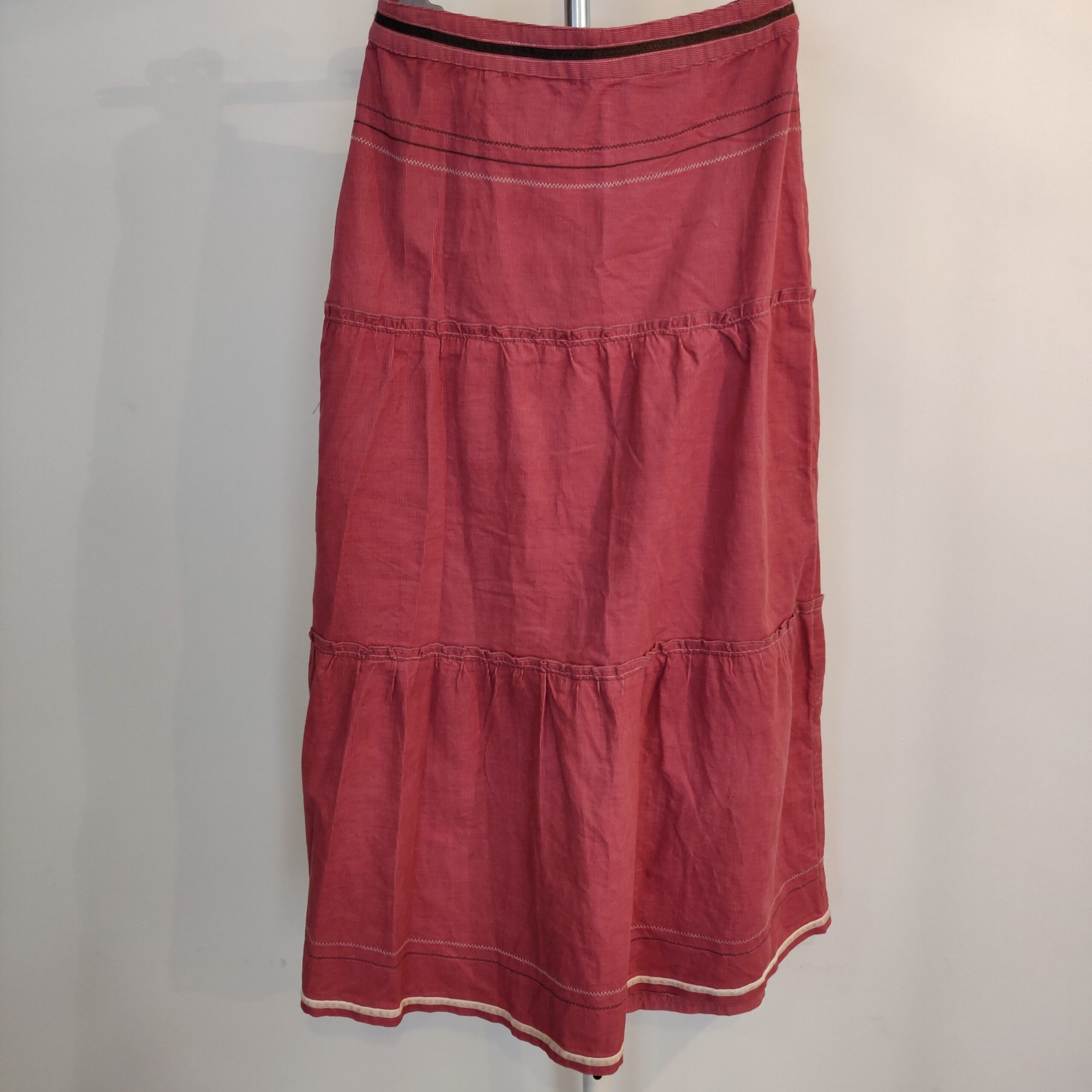Autres commentaires : Jupe longue en velour cotelé léger de couleur framboise avec taille réglable (élastique intérieur) liseré crème