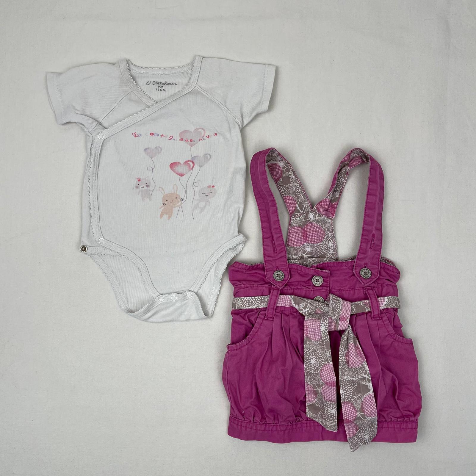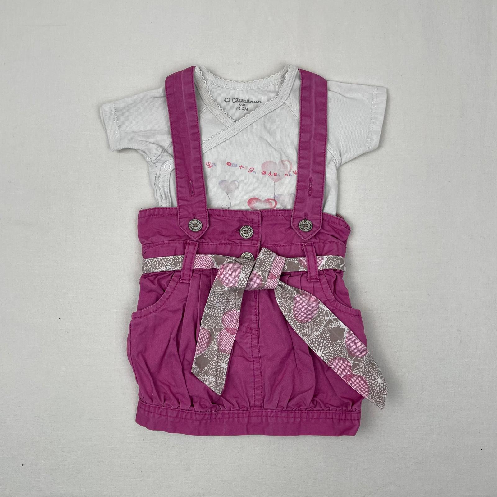 Autres commentaires : Jupe en toile effet boule rose fuchsia Tape à l’oeil, avec bretelles amovibles et réglables par boutons, fermeture devant par boutons et par ceinture à nouer en tissu beige blanc et rose, taille ajustable par élastique intérieur. OFFERT : Body blanc croisé manches courtes Kitchoun, devant motifs petits animaux tenant des ballons en forme de coeurs roses et mauves avec inscription « Les compagnons de rêve ». Petit défaut : quelques fines peluches sur le devant du body.