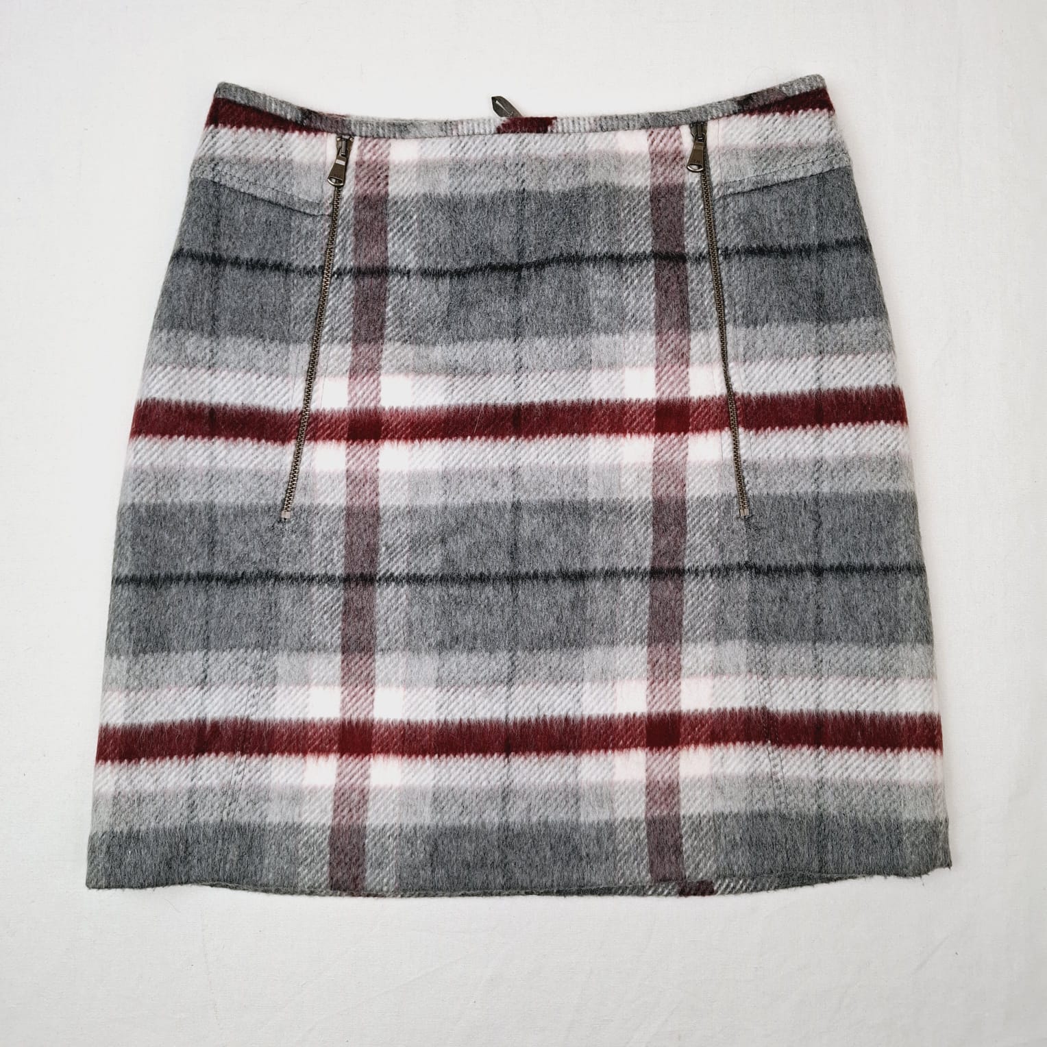 Autres commentaires : Jupe courte en laine a carreaux gris bordeaux, deux Zips décoratifs devant, fermeture par zip au dos, 50% polyacrylique, 25% laine, 25% polyester, doublure 100% acétate, taille 6.