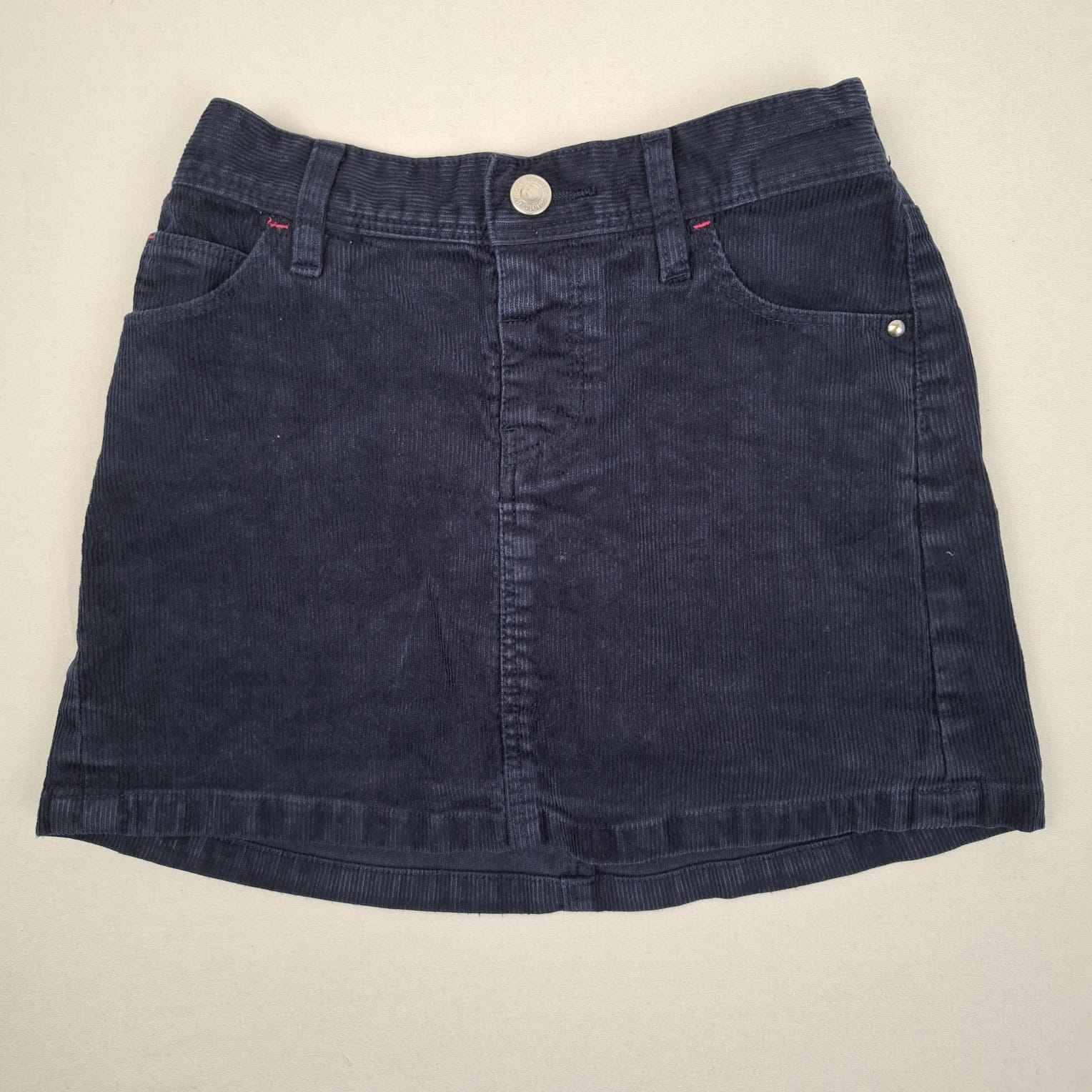 Autres commentaires : 1% élasthanne. Jupe bleu foncé en velours côtelé, fermeture par crochet, taille élastiquée au dos.