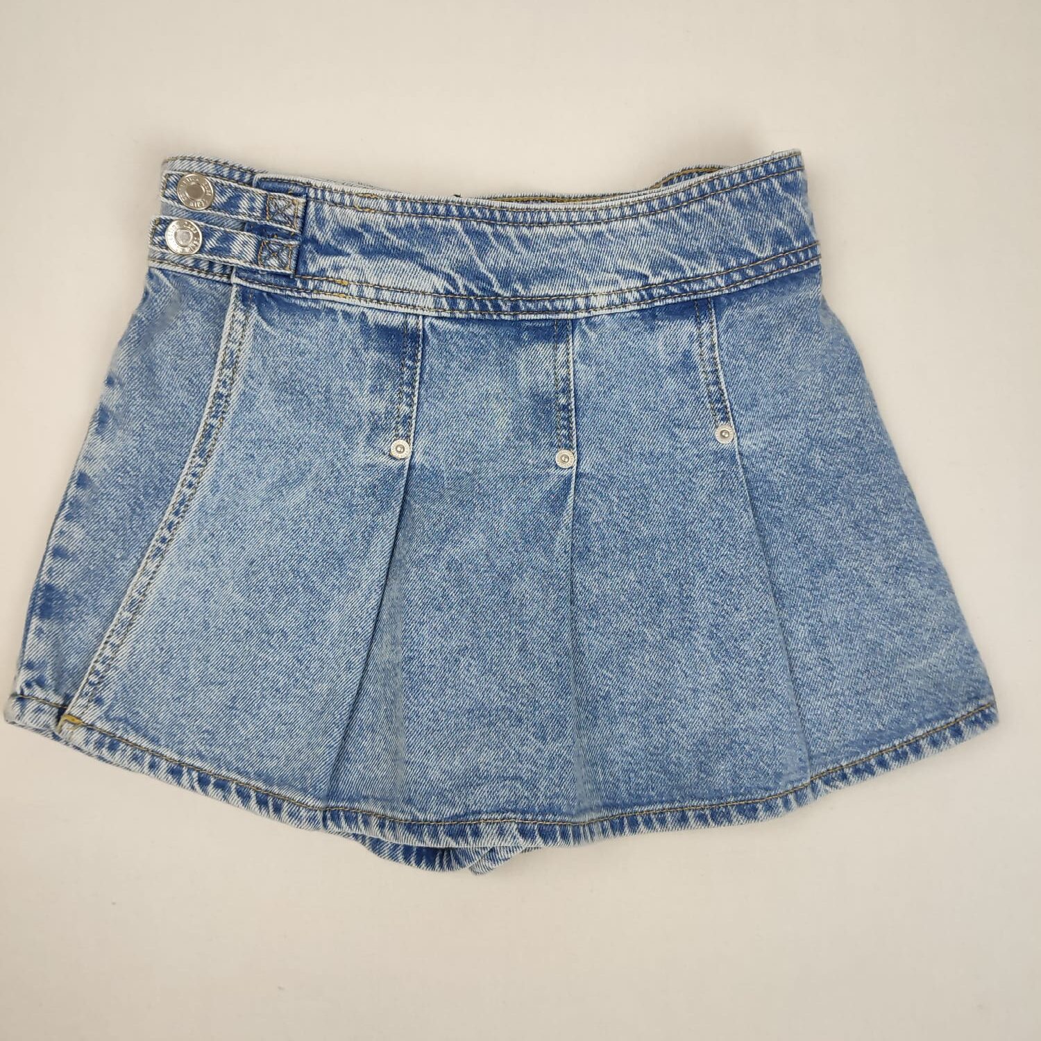 Autres commentaires : Jupe-short effet portefeuille en jean denim, ceinture ajustable par élastique intérieur, fermeture par zip et boutons pression.