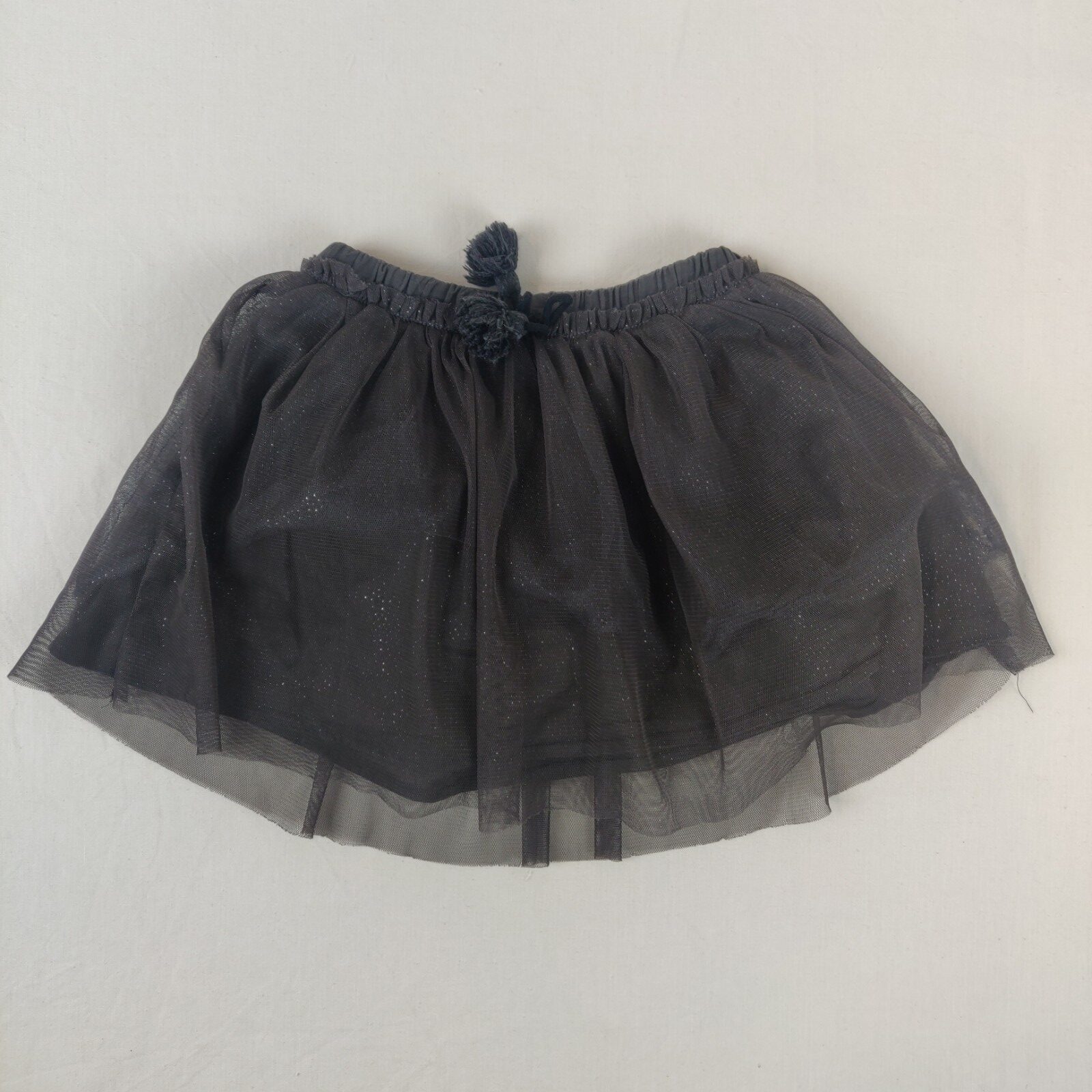 Autres commentaires : Jupe doublée en tulle marron pailleté. Taille élastique avec un noeud central noir à pompons.