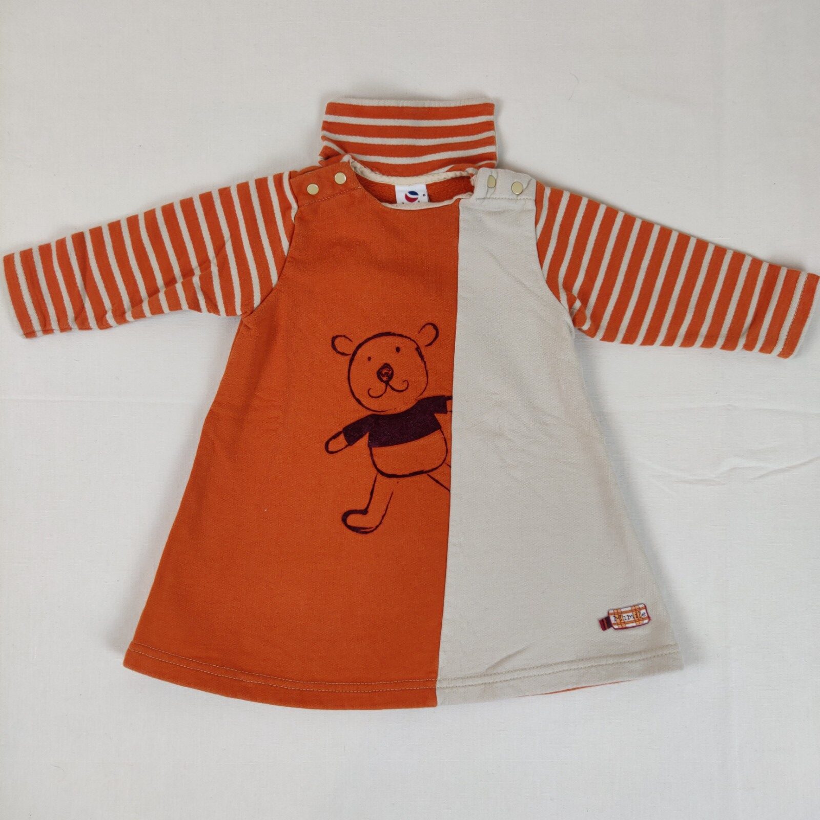 Autres commentaires : Robe à manches longues – orange et beige. Les manches sont oranges avec des rayures beiges – motif central prune ours. Ouvertures latérales à 2 boutons pression. Ecusson « Mimille » cousu à la taille. Col marin au dos.