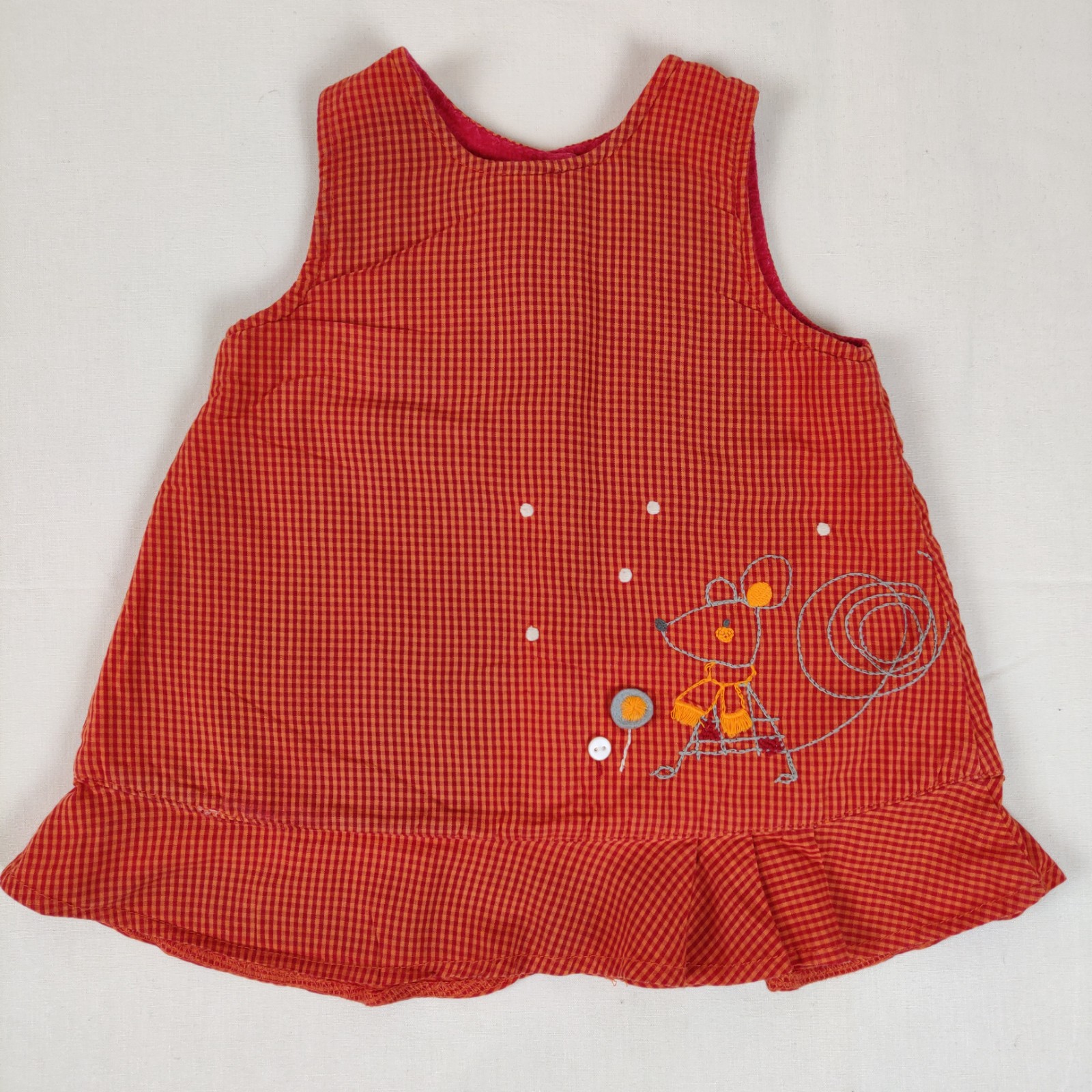 Autres commentaires : Robe doublée sans manche – à carreaux oranges et rouges avec motif latéral petite souris grise. La bordure de la jupe est volantée. Ouverture centrale au dos à boutons pression.