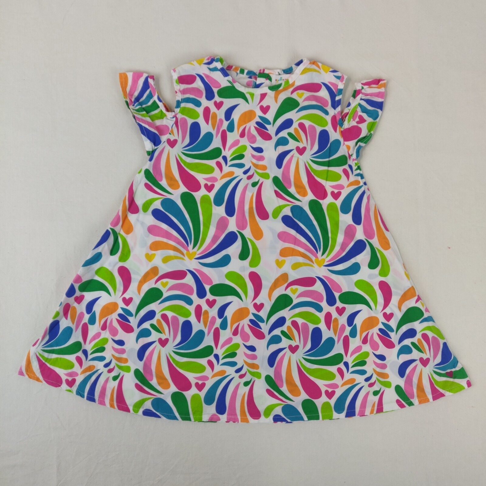 Autres commentaires : Robe à manches courtes en partie désolidarisées – blanc. Motifs multicolores en forme de gouttes et motifs coeurs.