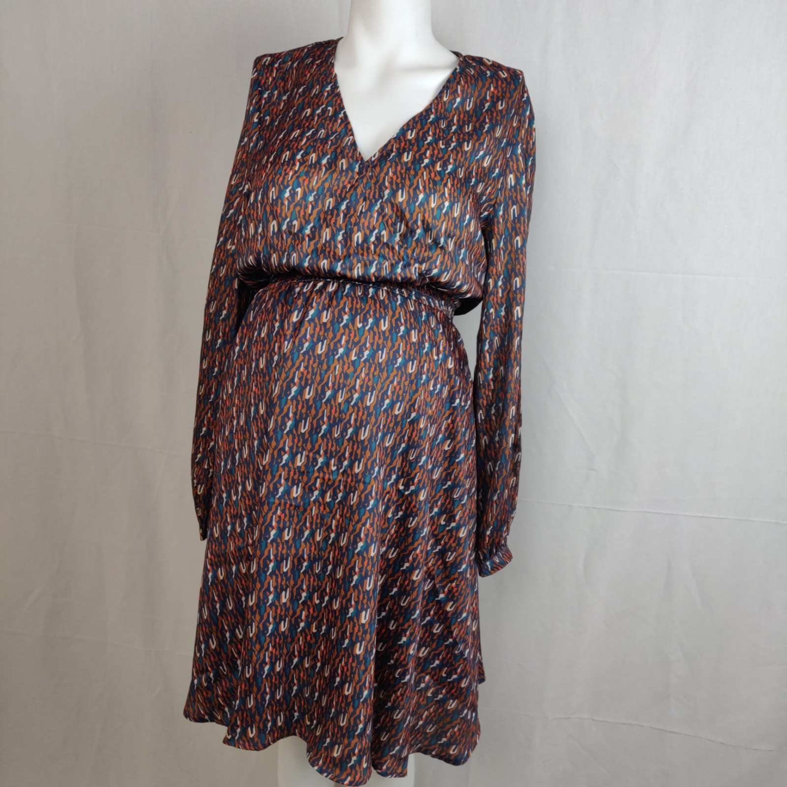 Autres commentaires : Robe longue tons verts, gris, rouille et orangés, col V imprimée fleurs by An’ge pour Femme, tissu fluide et léger, coupe évasée, encolure en V avec plis au niveau de la poitrine, manches longues avec une forme gigot. Ceinture élastique à la taille. Doublure bleu marine.