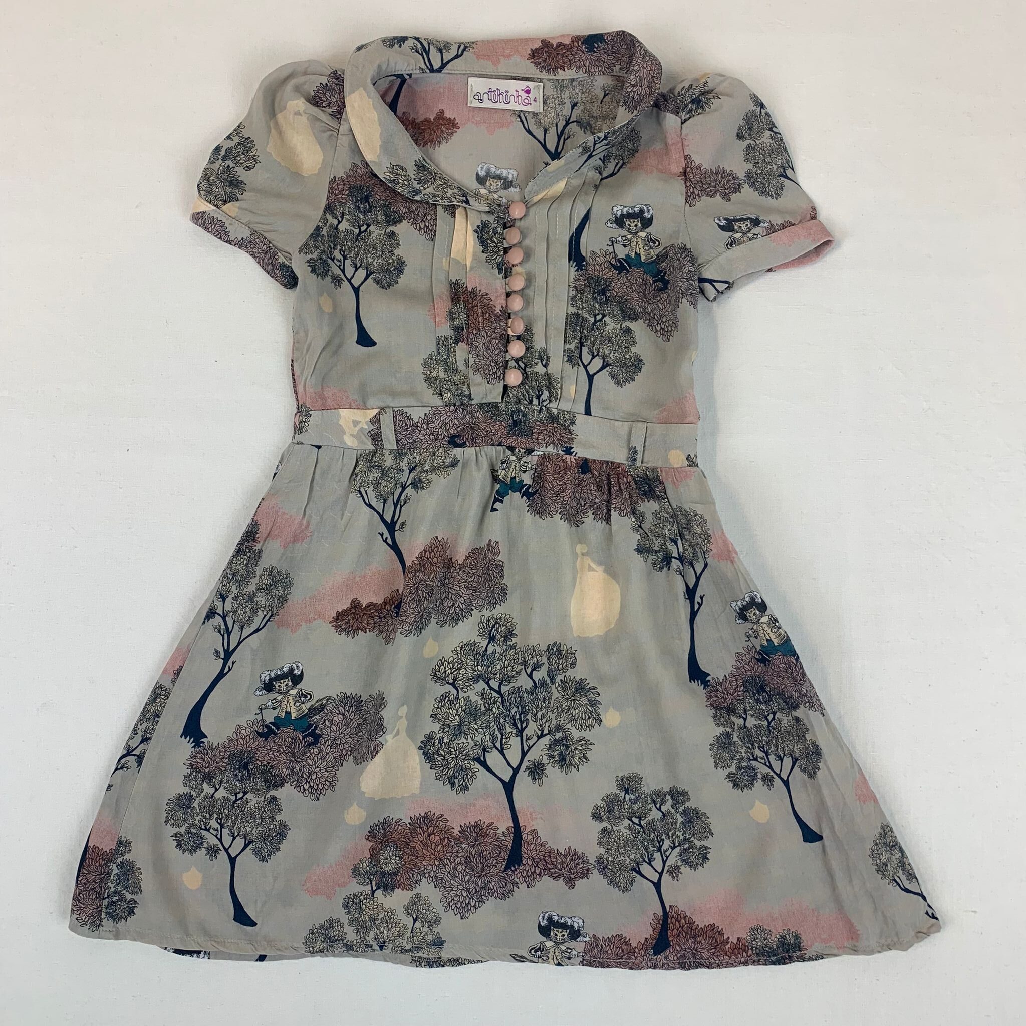 Autres commentaires : Robe beige manches courte en fleurette multicolore sombre avec une fermeture par bouton devant.