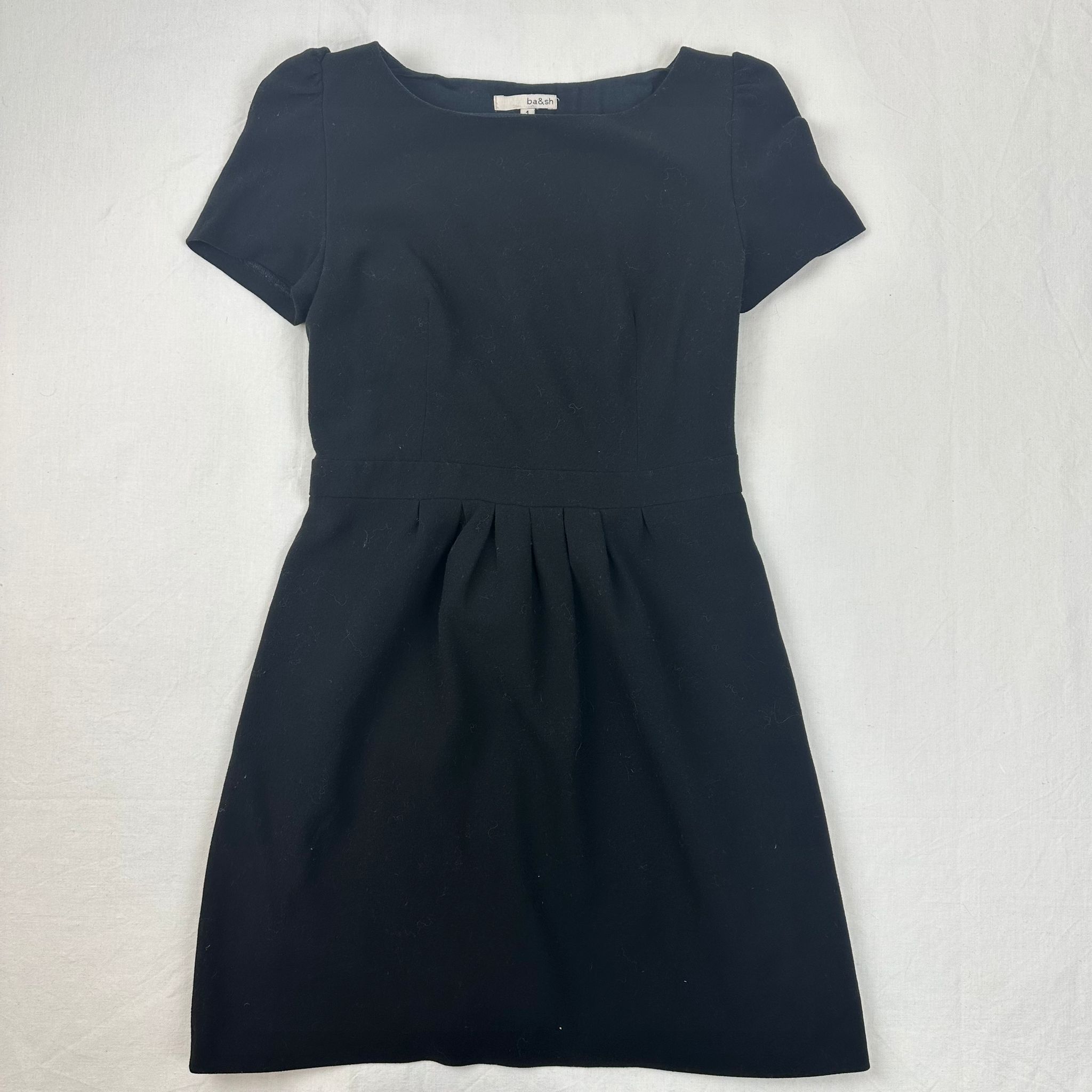 Autres commentaires : 33% viscose et 4% elasthanne. Robe mini noir manches courtes avec une fermeture en zip sur le côté. doublure toile de coton