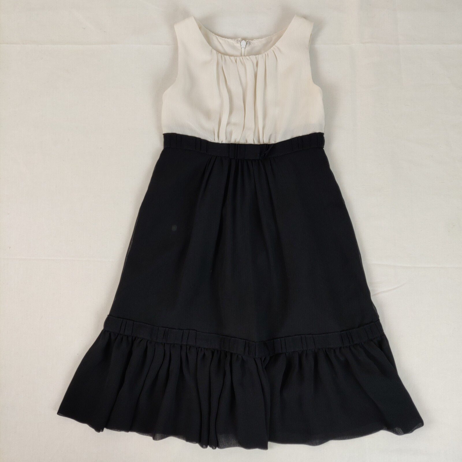 Autres commentaires : Robe à larges bretelles en crêpe bicolore – écru pour la partie supérieure et noire pour la partie jupe. Taille cintrée par un bandeau noir réhaussé d’un noeud noir décoratif. Ouverture centrale au dos à fermeture éclair. Pour occasion spéciale