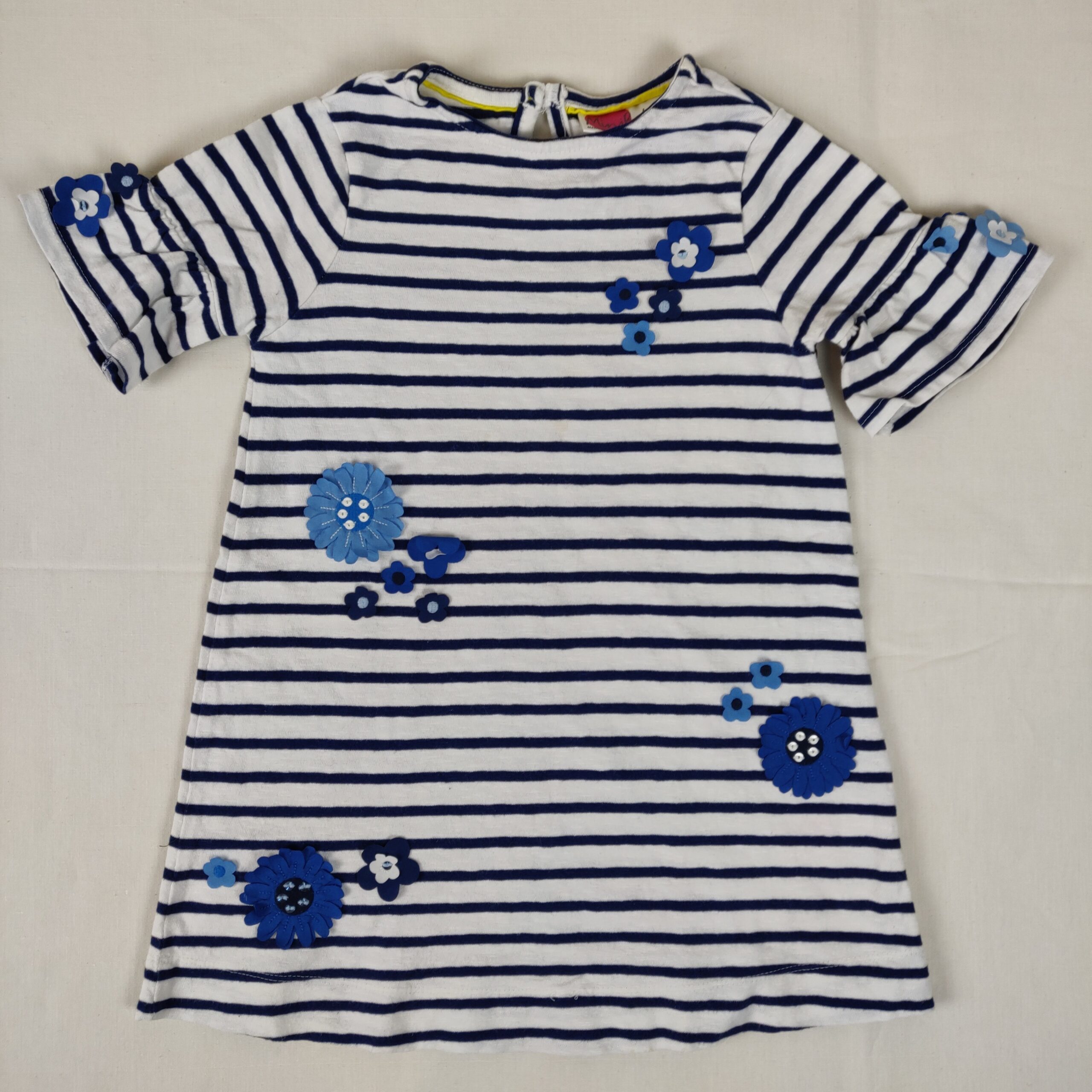Autres commentaires : Robe manches courtes, blanche rayée bleu style marinière, avec fleurs bleues en relief, fermeture par boutonnière unique au niveau du col dans le dos. Manches légèrement volantées.