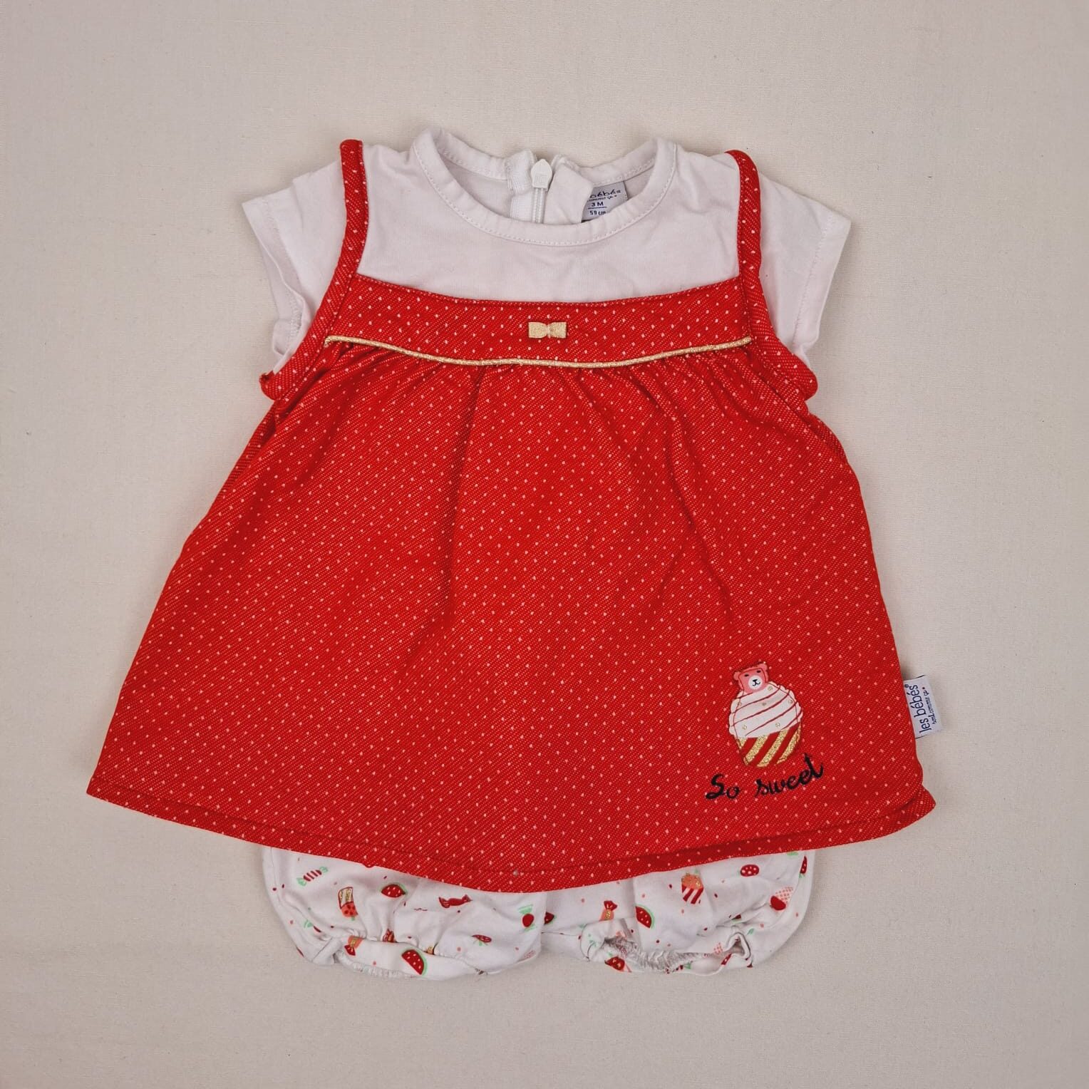 Autres commentaires : 24% polyester, 4% élasthanne. Body blanc à manches courtes avec robe rouge accroché, fermeture par zip au dos, col rond, fermeture au niveau des cuisses