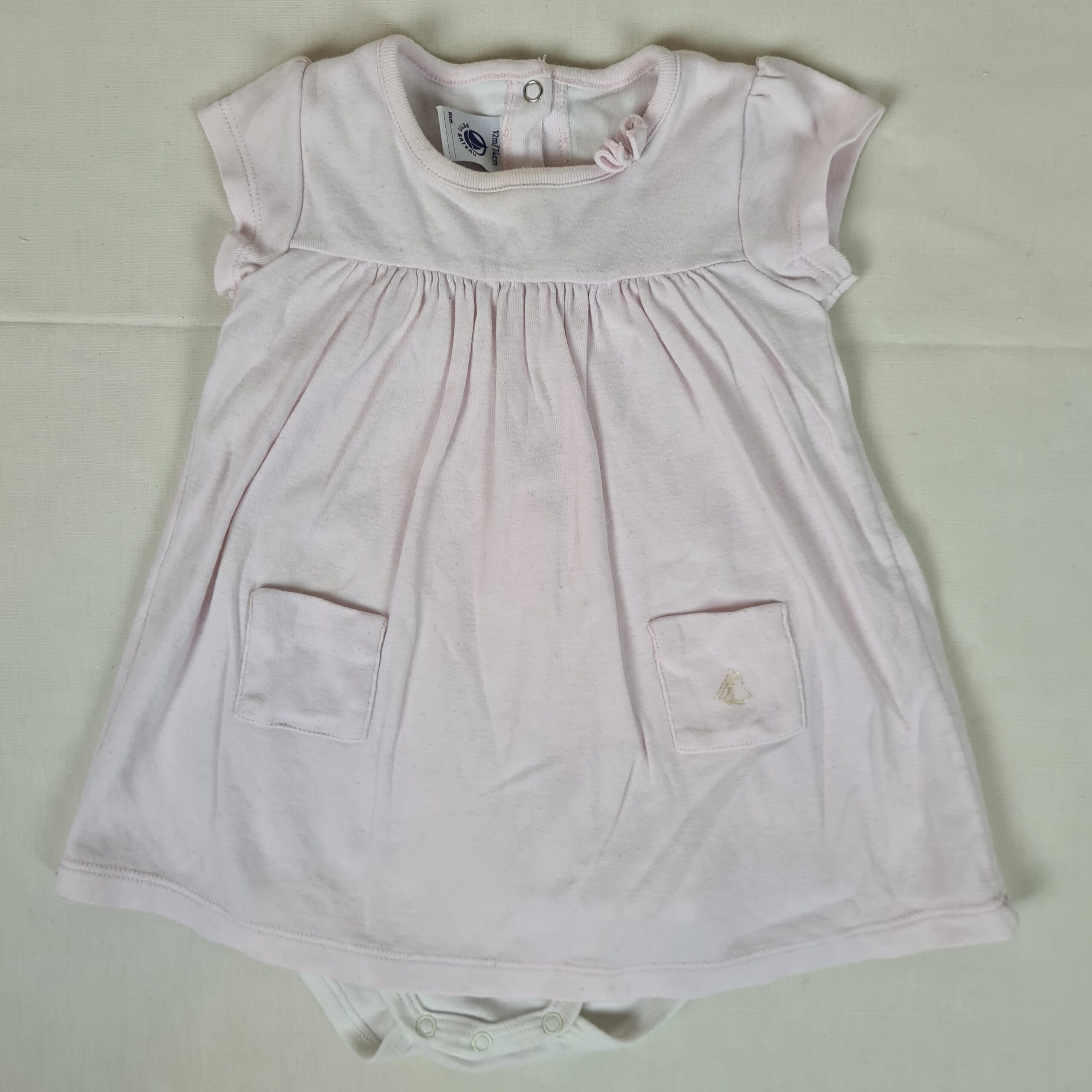 Autres commentaires : Robe body rose pâle unie, col rond avec noeud, manches courtes, body intégré blanc. Bon état, légère coloration au niveau du col.