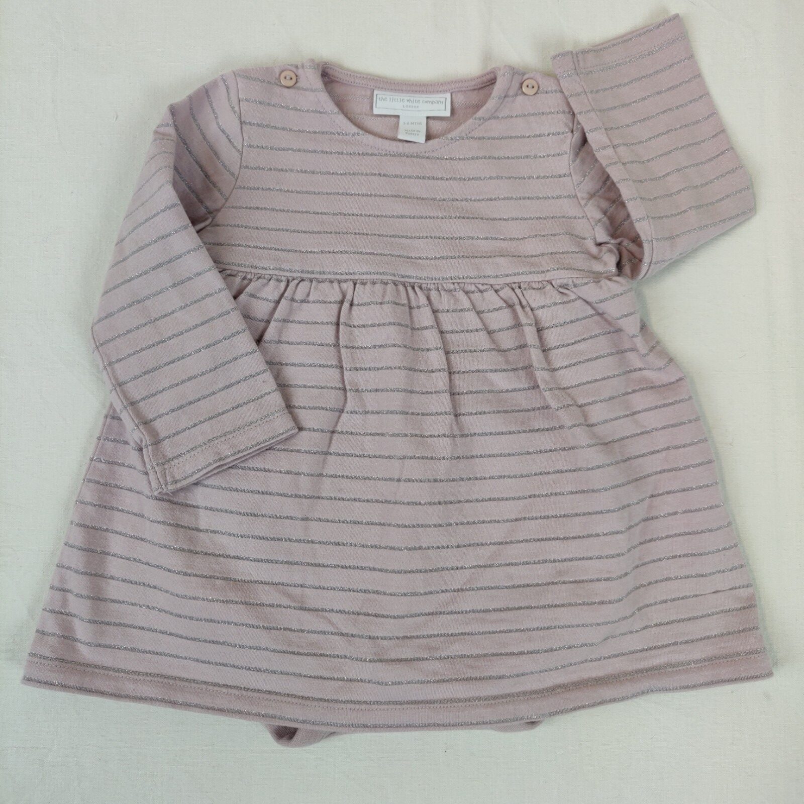 Autres commentaires : 4% fibre métallique, 3% polyamide. Robe vieux rose à rayures grises argentées. Fermeture par 1 bouton à chaque épaule. body intégré
