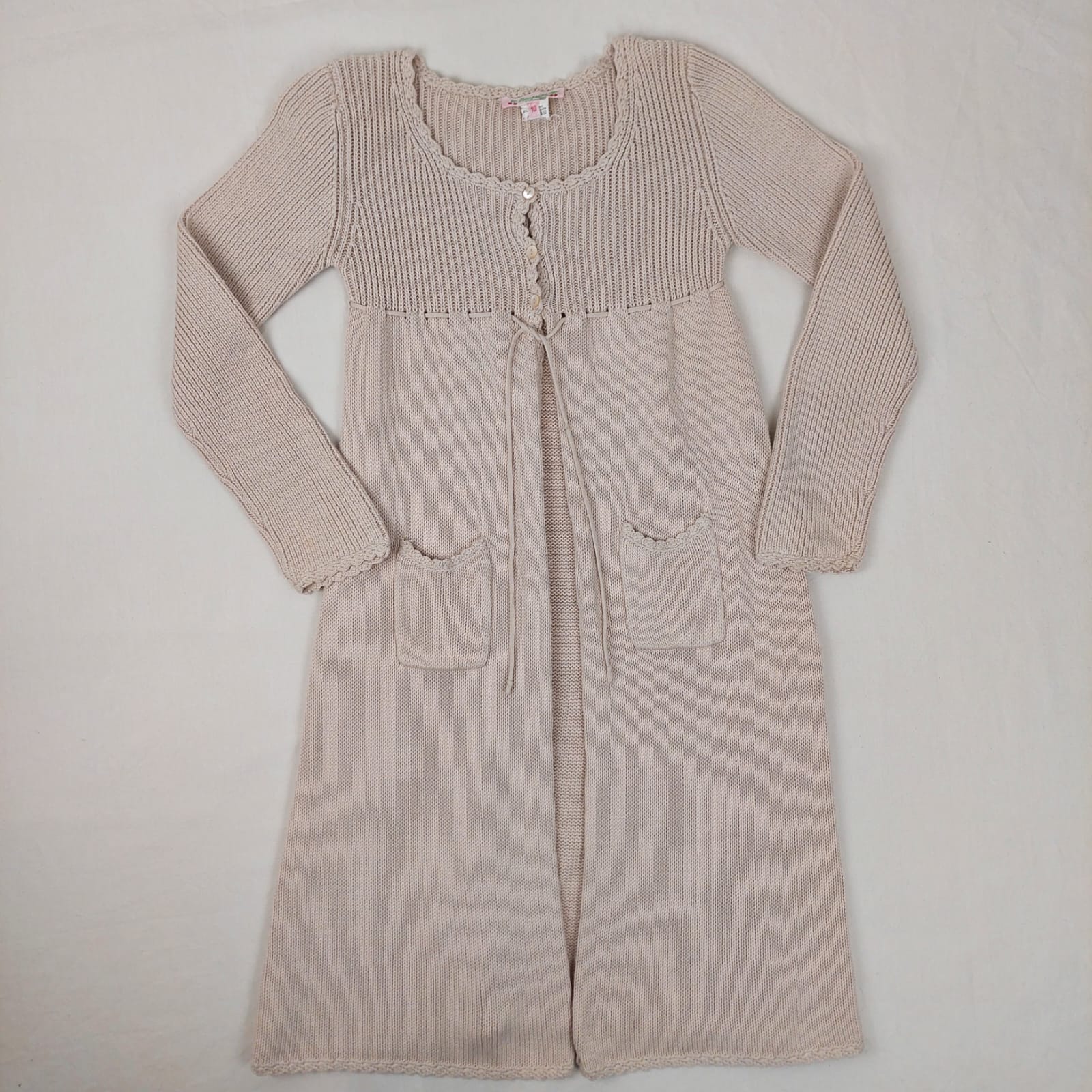 Autres commentaires : Robe beige en maille avec des boutons au niveau du col et des poches