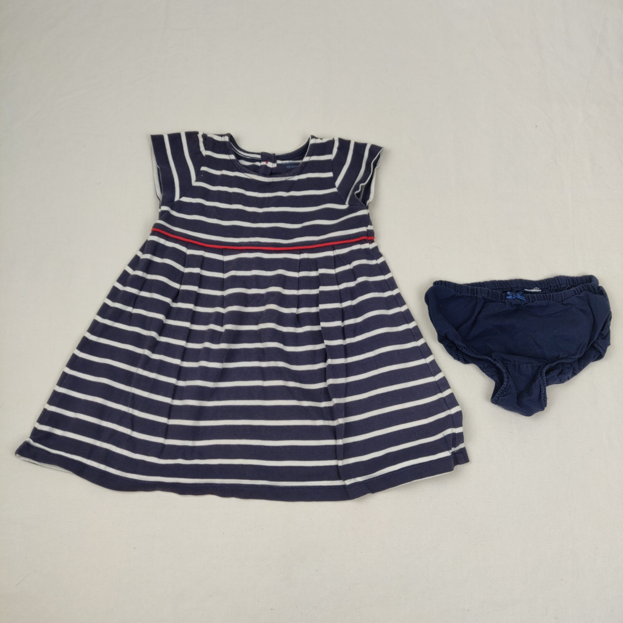 Autres commentaires : Robe bleu marine rayée blanche, à manches courtes, ouverture dans le dos par boutons classiques, avec culotte bleu marine offerte, élastiquée et avec petit noeud devant, taille estimée (sans marque).