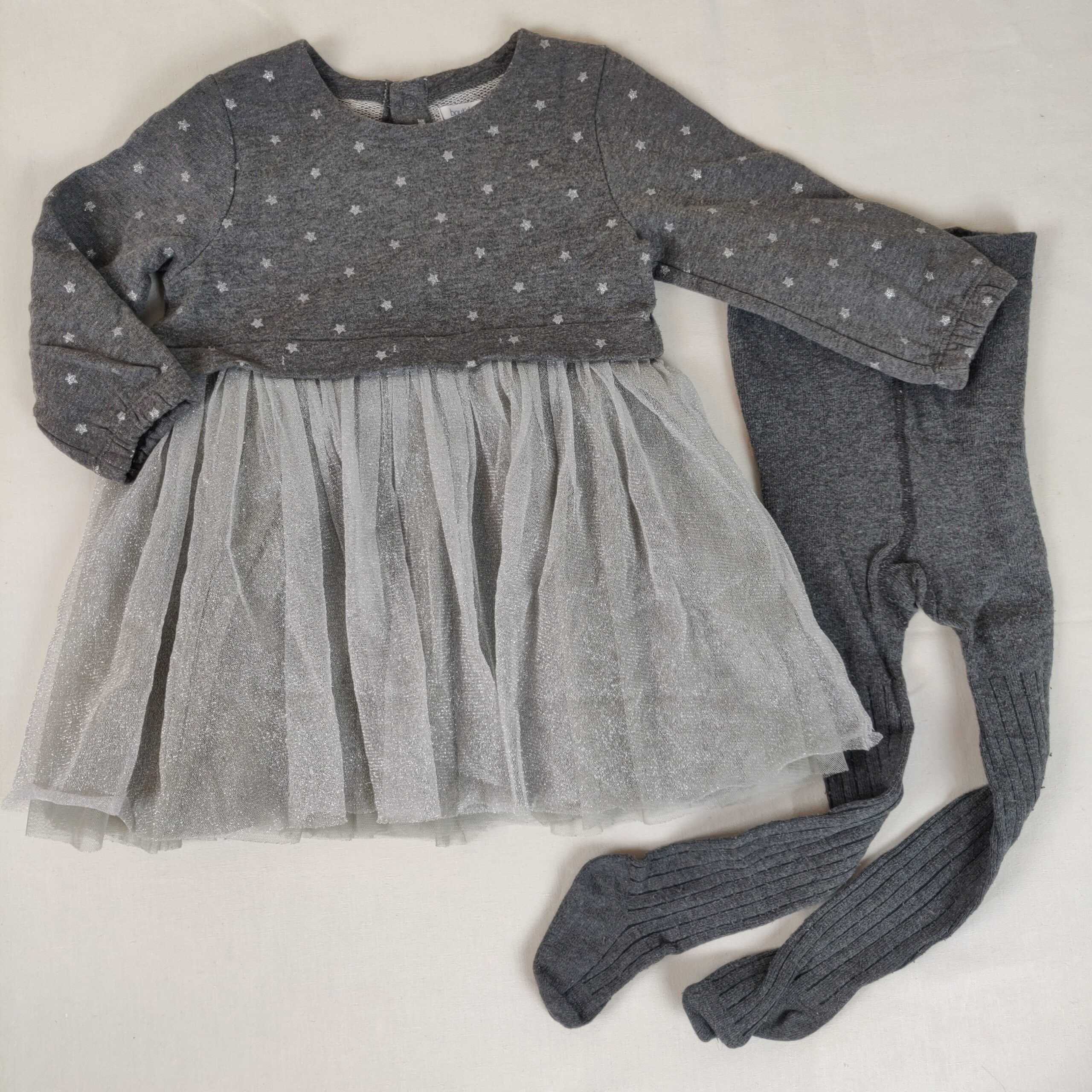 Autres commentaires : 35% polyester. Robe à manches longues – gris chiné à motifs étoiles argentées. Partie jupe en tulle doublé argenté et gris. Ouverture centrale au dos à 3 boutons pression. Un collant « H&M » gris offert. Léger effet pelucheux.