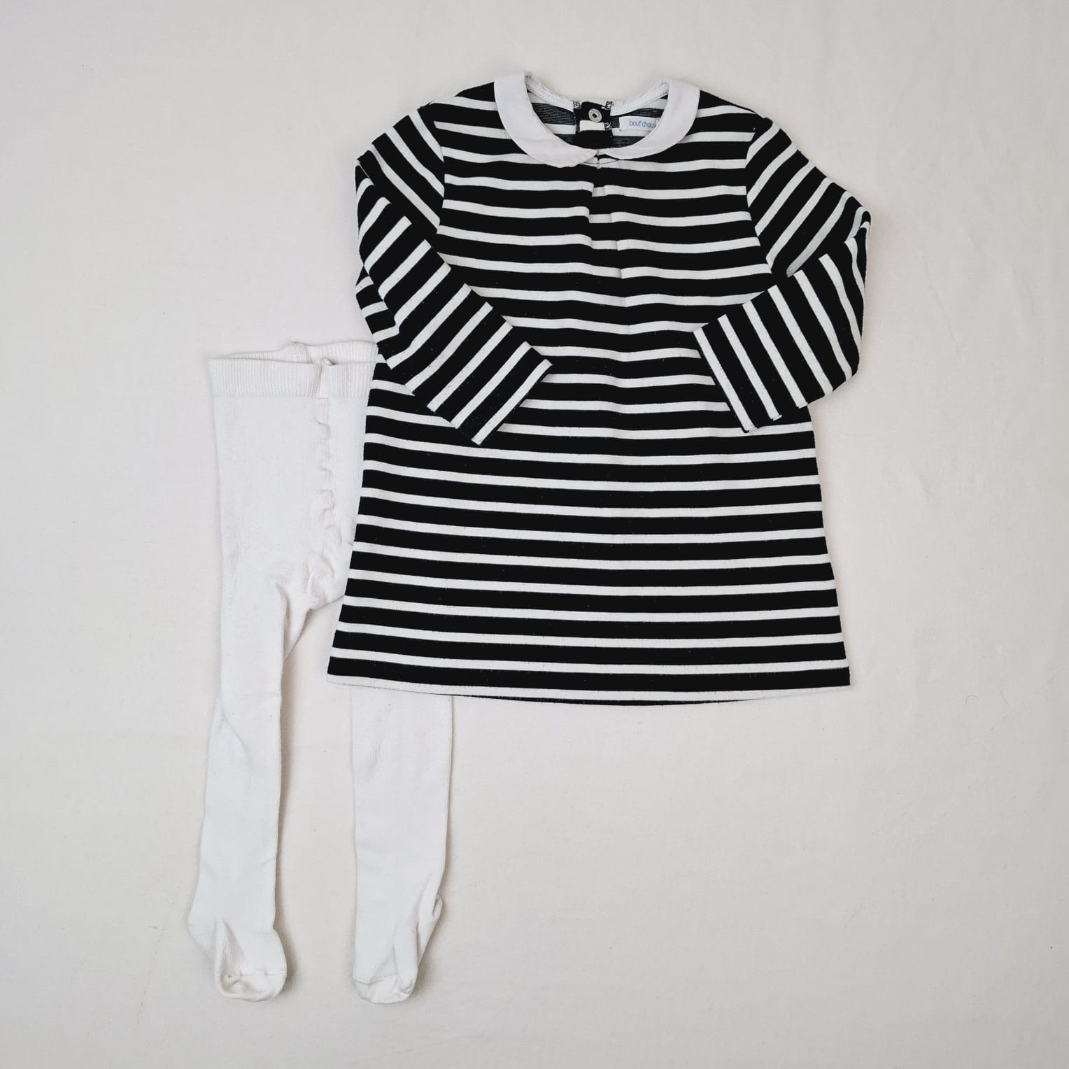Autres commentaires : 30% coton, 1% élasthanne. Robe bleu marine à rayures blanches à manches longues, col Claudine, fermeture par boutons pression au dos. Collants blanc, 80% coton, 17% polyamide, 3% élasthanne.