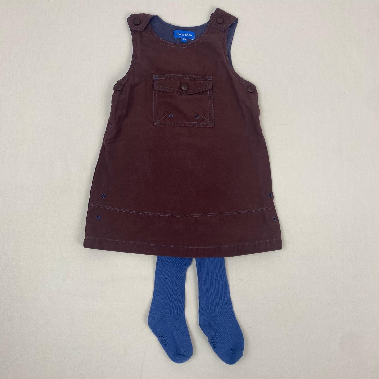 Autres commentaires : Robe à bretelles marron, fermeture par boutons pression, 30% polyamide. – OFFERT : paire de collants bleus. Petit défaut : tache sur le collant.