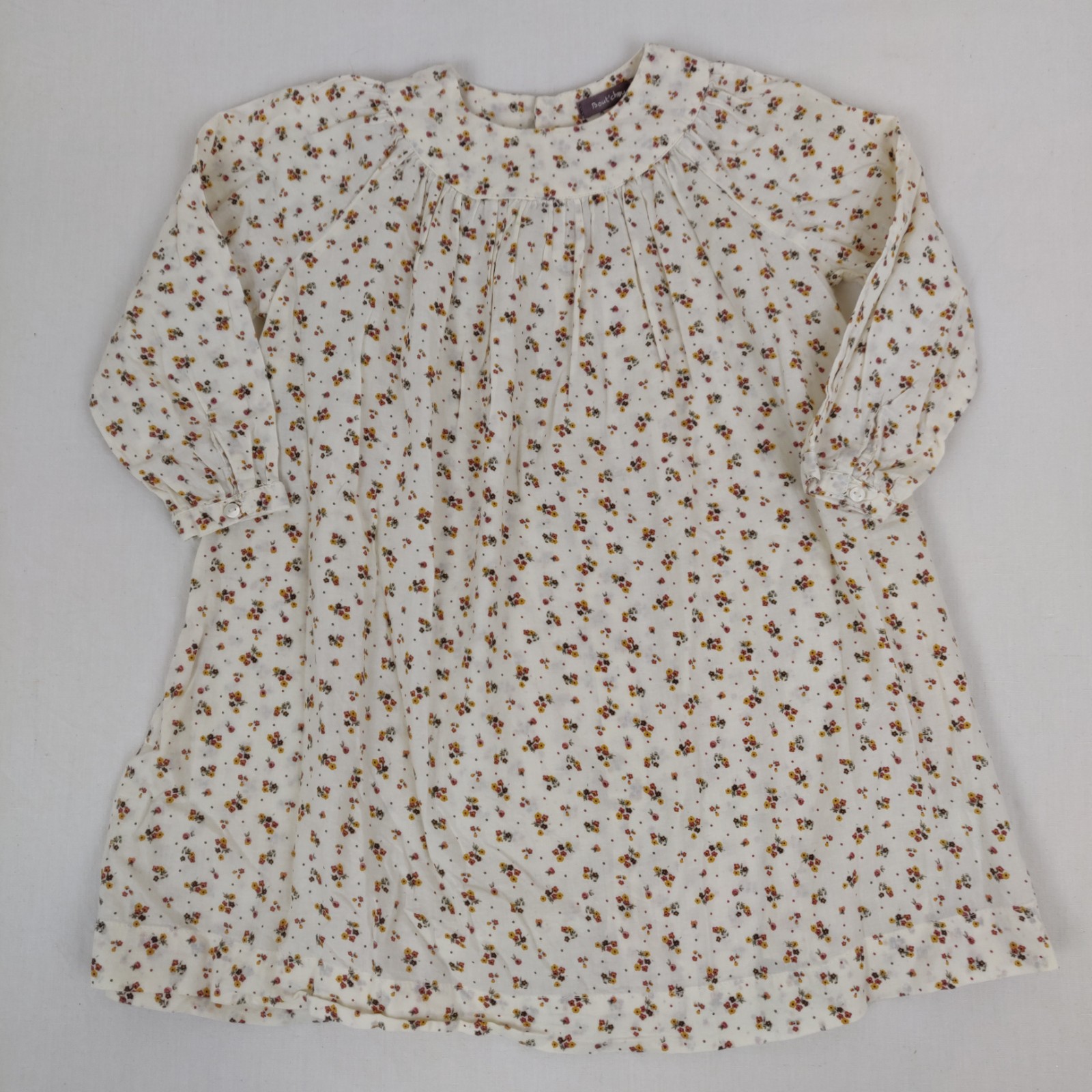 Autres commentaires : Robe beige en toile manches longues, mi long en fleuri, col rond et une fermeture au dos par boutons.