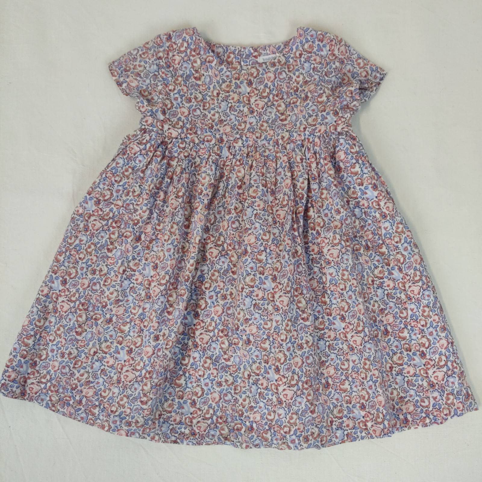 Autres commentaires : Robe à manches courtes finement doublée – blanc à motif liberty marron, bleu, rose, et bleu marine. Ouverture centrale au dos à boutons.