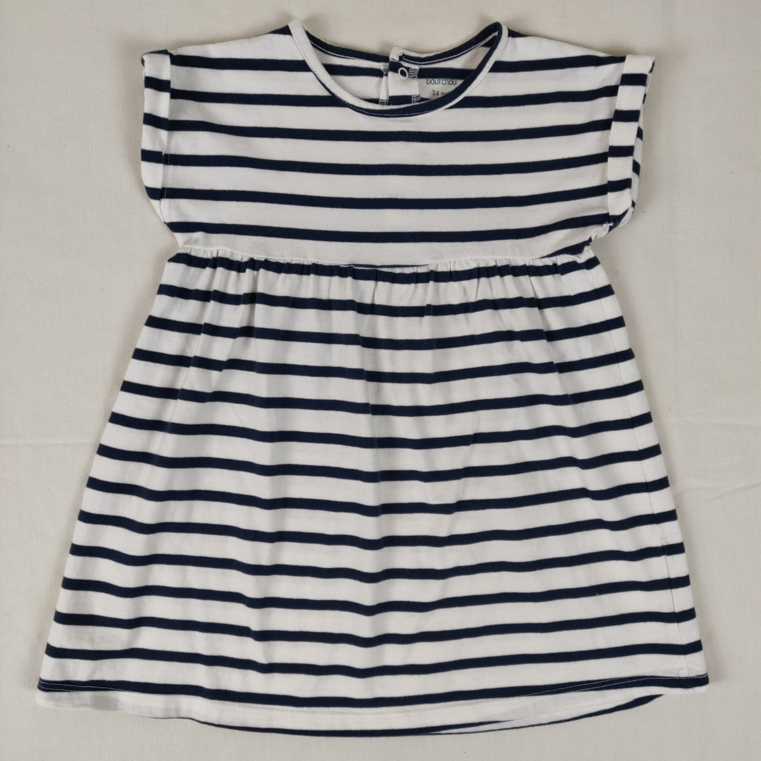 Autres commentaires : Robe marinière blanche à rayures bleus marines, manches courtes avec revers et jupe ample.