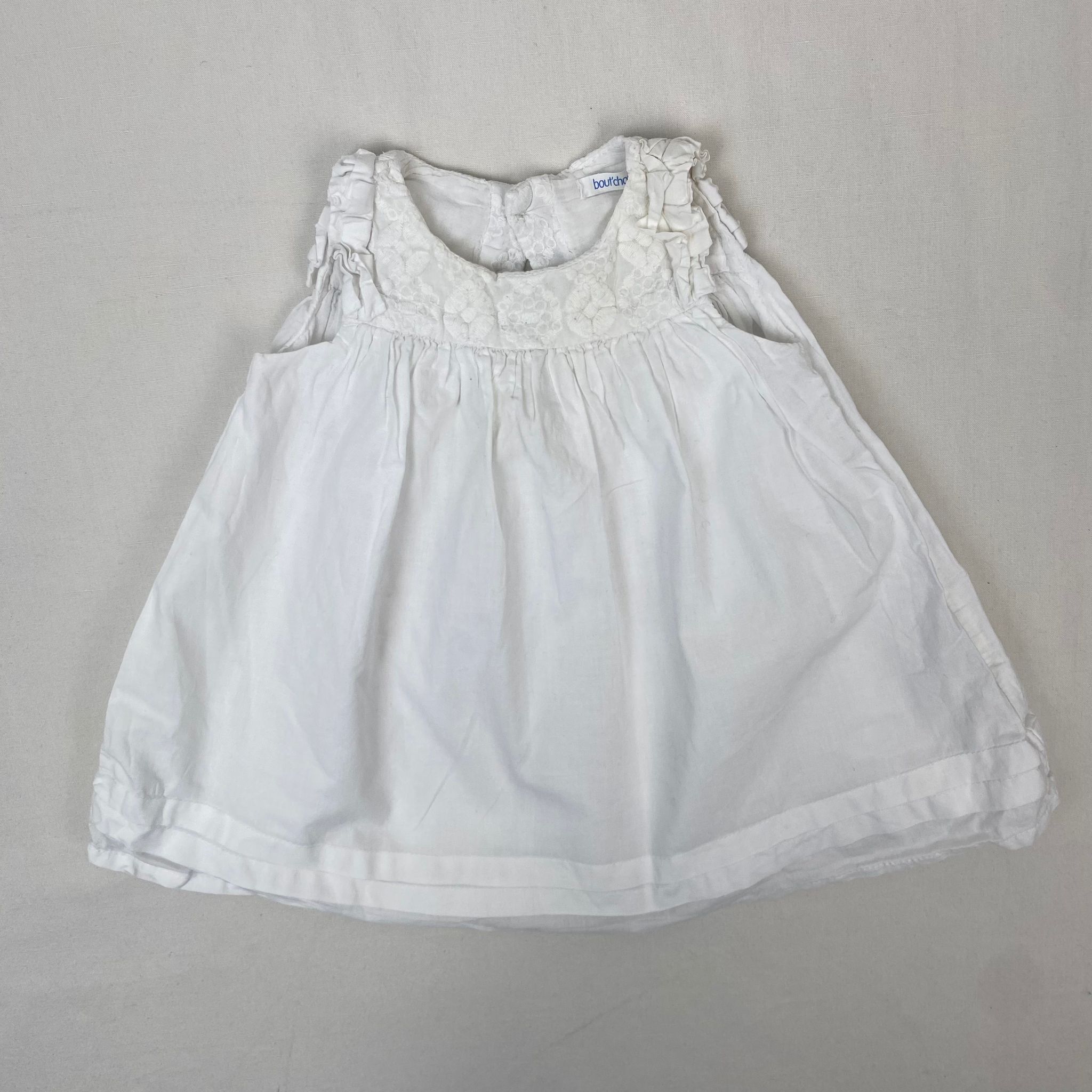 Autres commentaires : Robe blanche Bout’chou avec des motifs de fleurs brodées sur le haut du corps, fermeture par boutons au dos.