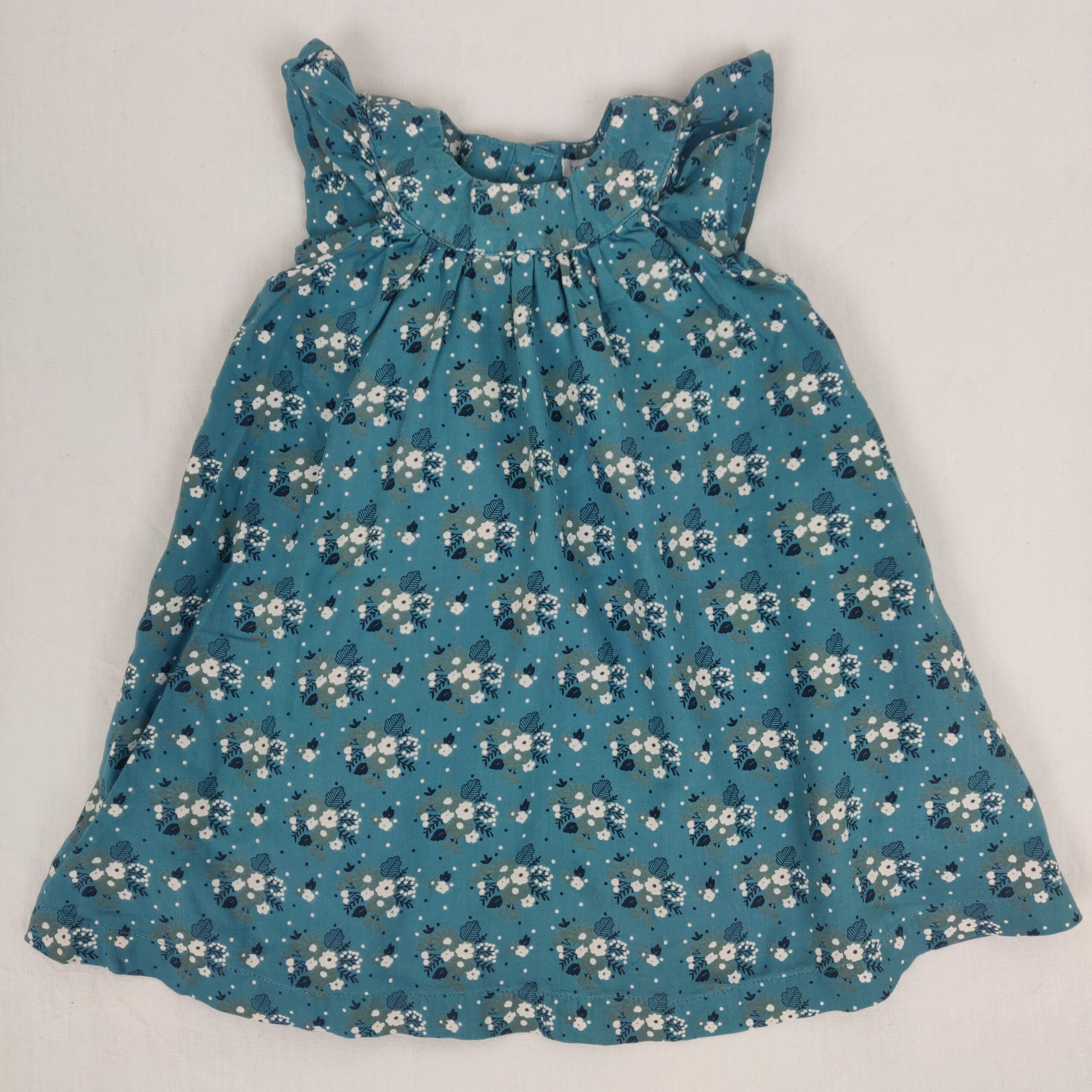 Autres commentaires : Robe verte doublée coton, manches courtes volantées, motif fleurs blanches et bleu marine.
