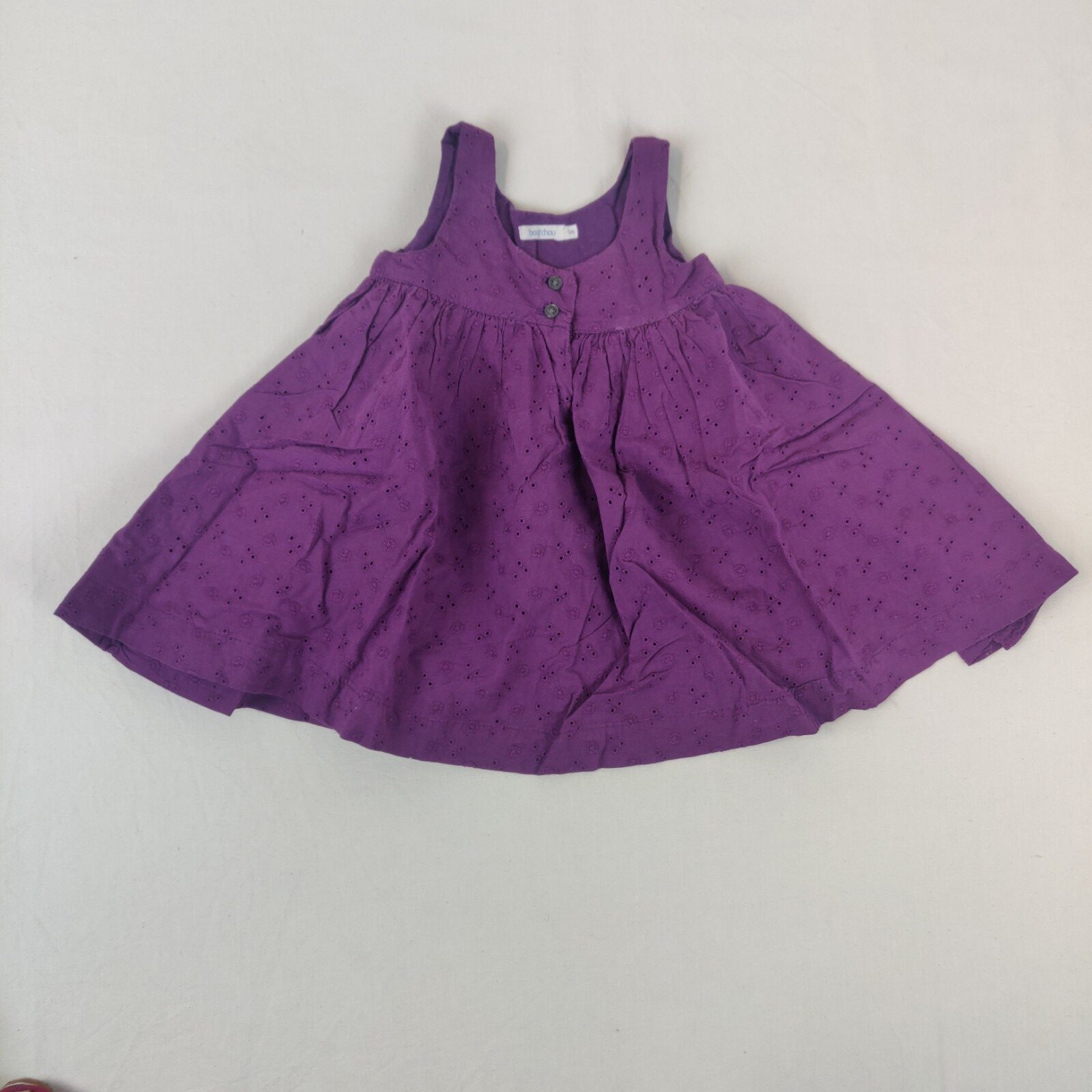 Autres commentaires : Robe sans manche violette présentant des motifs floraux en broderie anglaise. Ouverture centrale à 2 boutons.