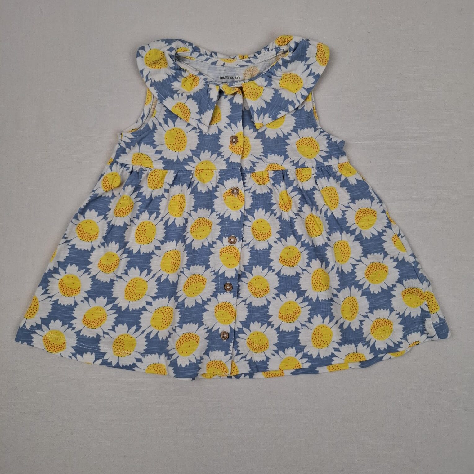 Autres commentaires : Robe bleu Bout’chou 6M avec motifs fleurs blanches et jaunes , sans manche ,fermeture bouton avant