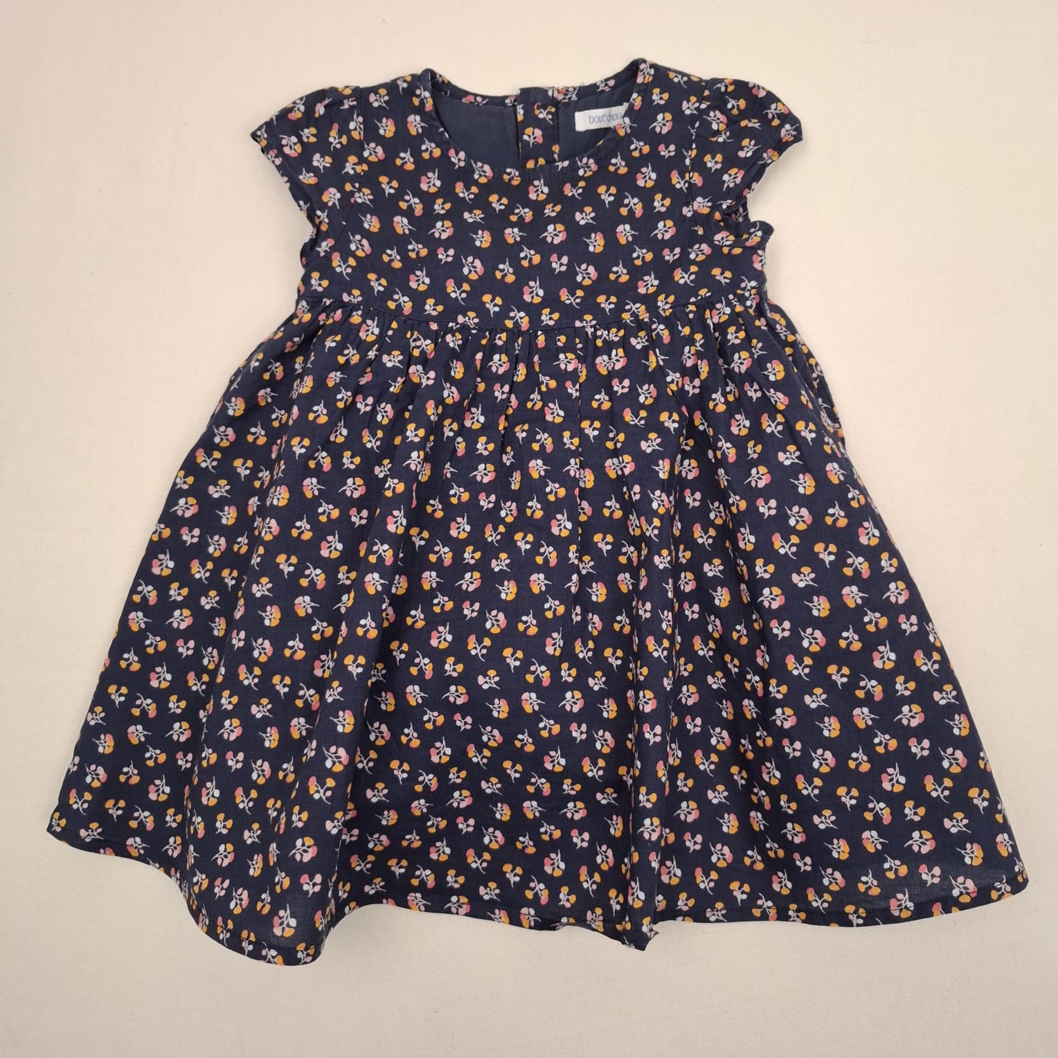 Autres commentaires : Robe à manches très courtes bleu marine, motif petites fleurs orange, roses et grises, col rond, fermeture par boutons dans le dos, taille haute et froncée