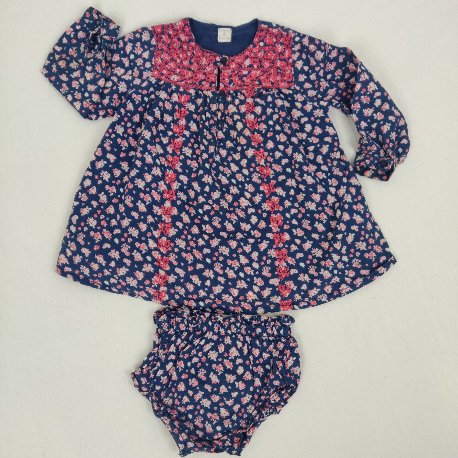 Autres commentaires : Robe manches longues bleu en fleurette, col rond 3 boutons accompagné d’une petite culotte du même motif. Petit défaut: petite tâche dans le col.