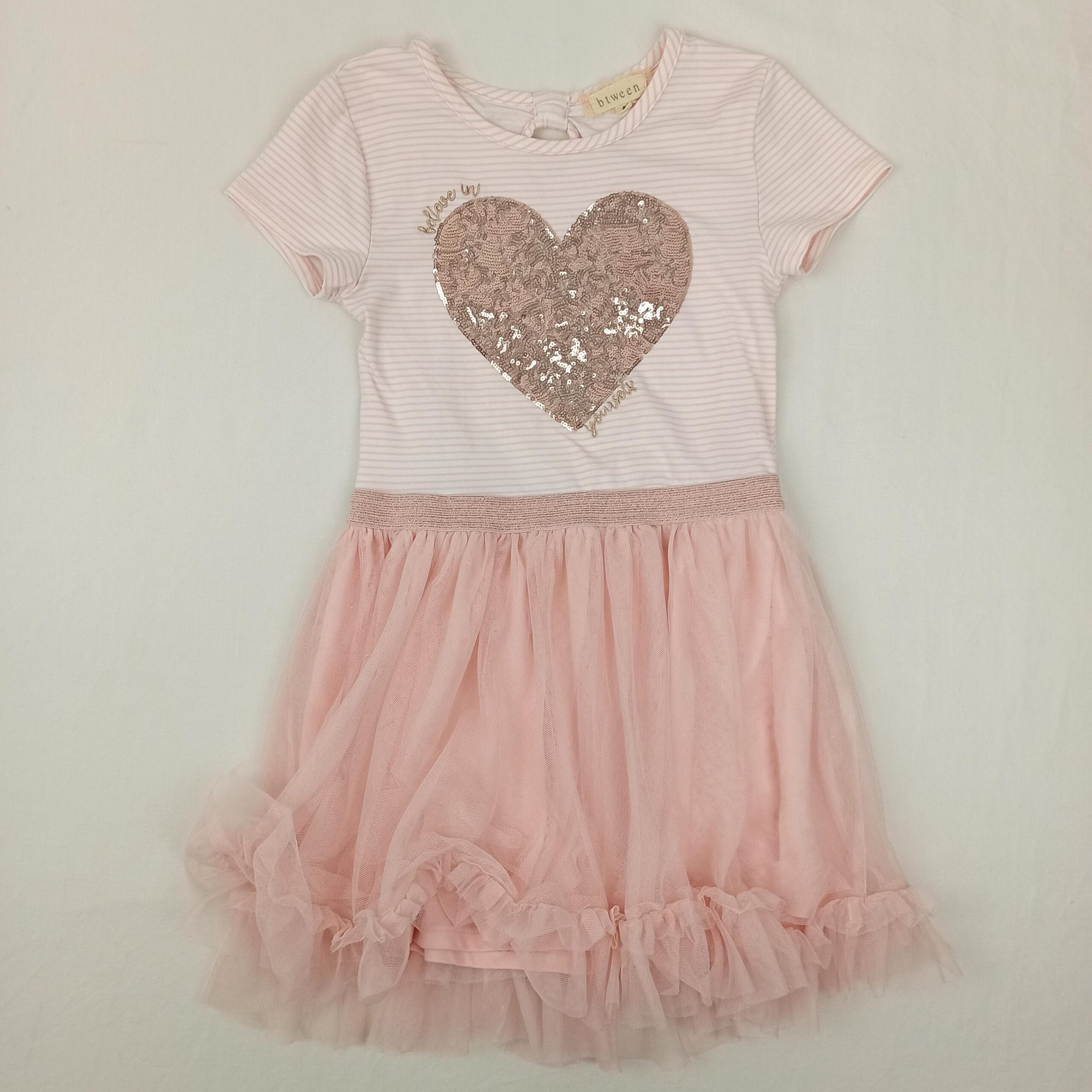 Autres commentaires : Corps 8% Spandex. Robe rose avec haut blanc rayé rose, manches courtes et coeur en paillettes avec l’inscription « Believe in yourself » ; ceinture élastiquée avec fils cuivrés ; jupe en tulle rose avec doublure intérieure en polyester.