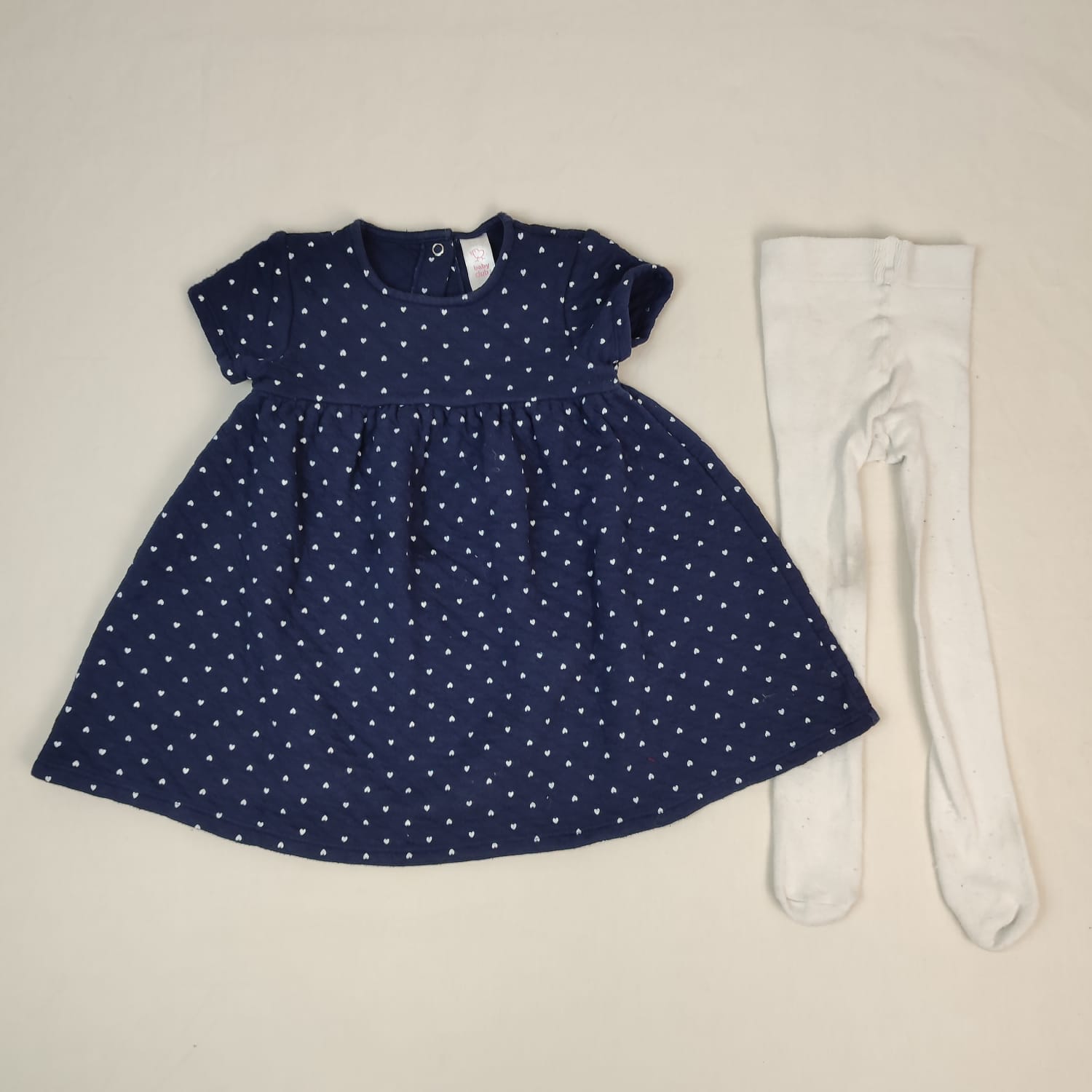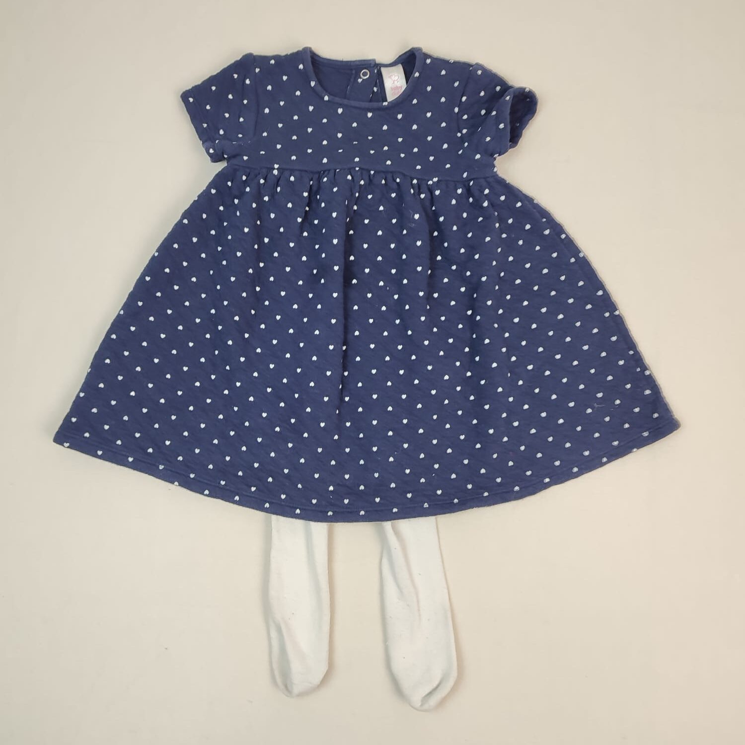Autres commentaires : 18% polyester. Robe manches courtes bleu foncé matelassée motif mini cœurs blancs, fermeture par boutons pression au dos, col rond. Collants blancs (fines peluches par endroit) OFFERT.