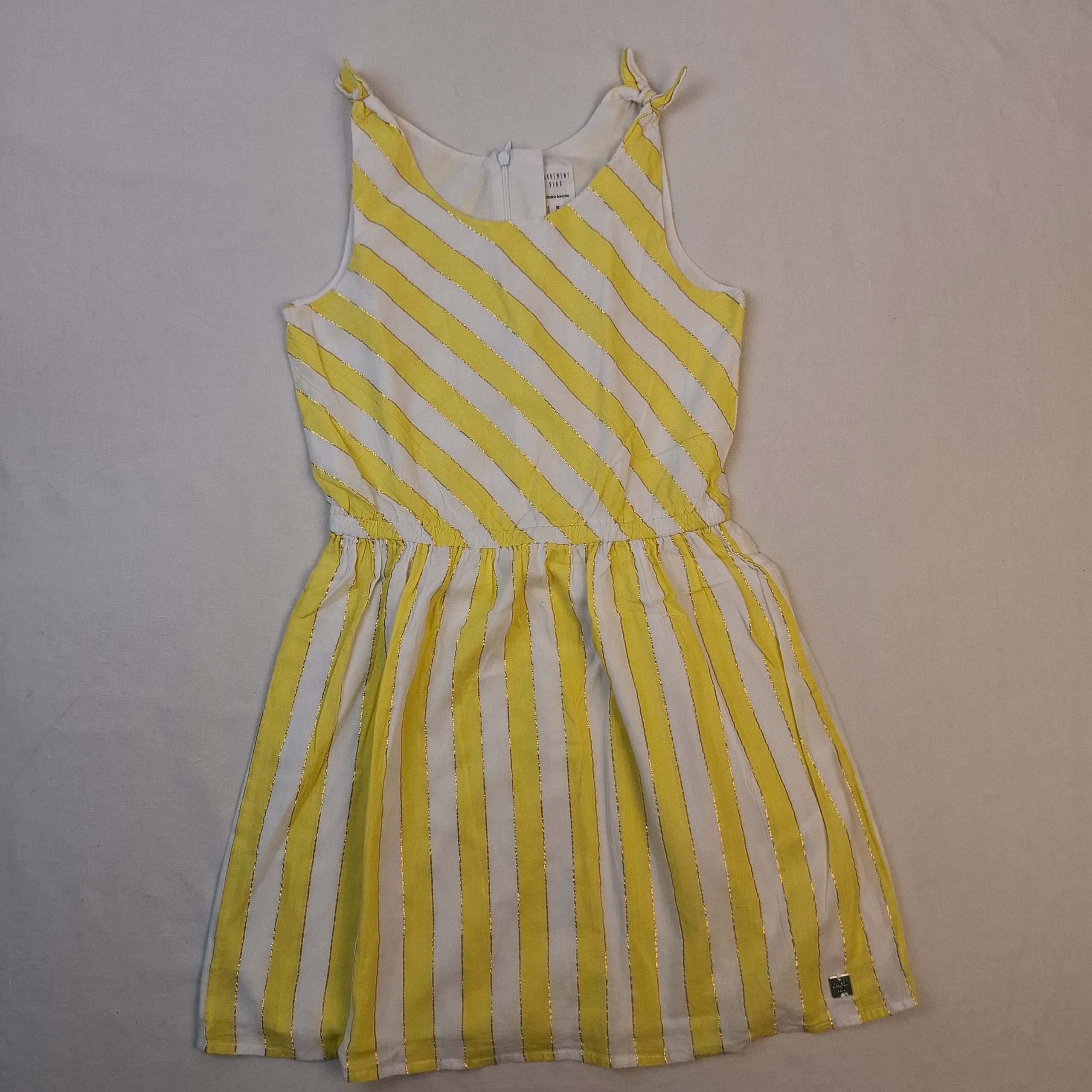 - Robe élégante sans manches, à bandes blanches et jaune citron, bordées d’un liseré doré (contient 2% de fibres métalliques), fermeture au dos par zip, taille élastiquée, doublure blanche en bas en 100% coton. Idéale pour vos cérémonies et fêtes printanières et estivales.