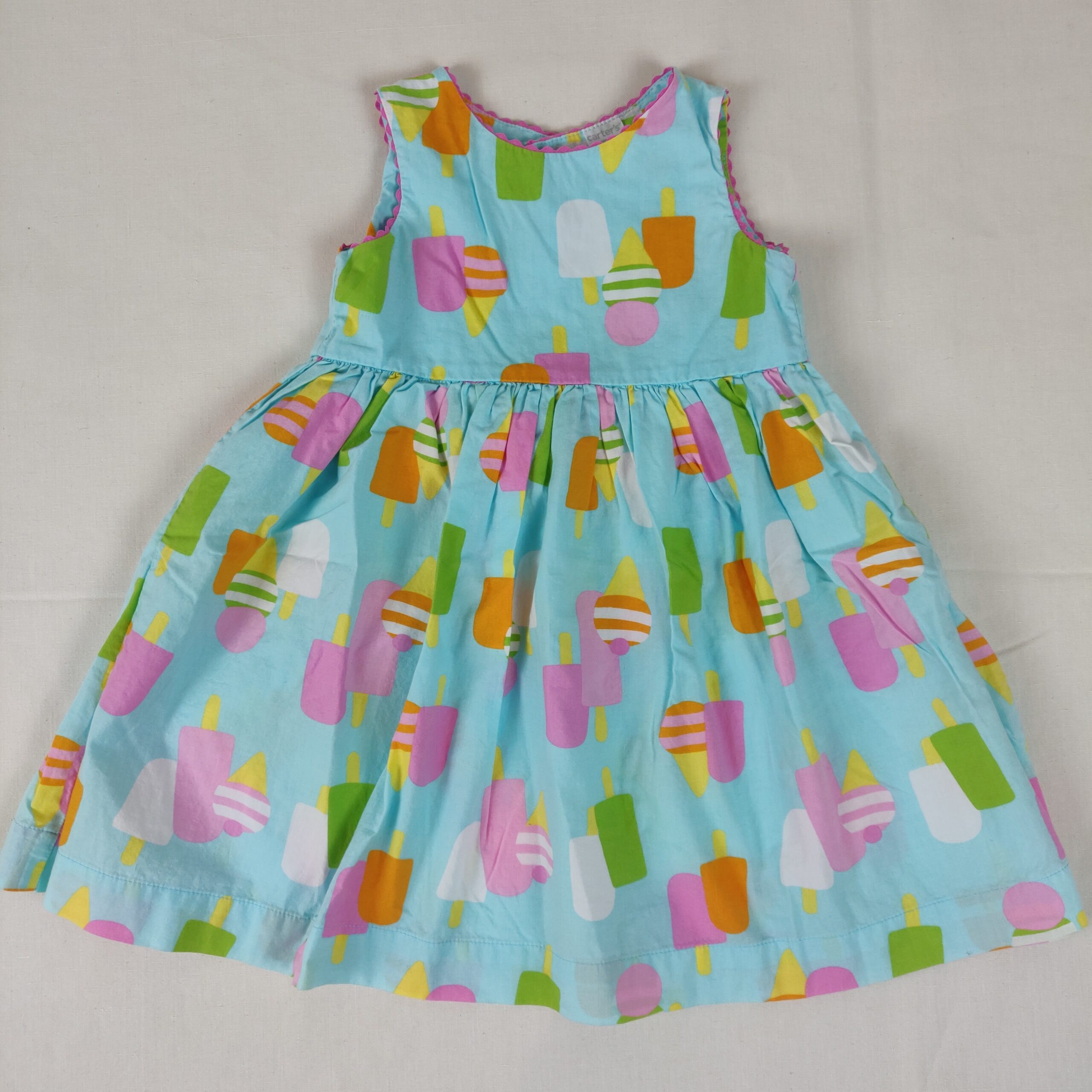 Autres commentaires : Robe sans manches bleu clair, motif glaces cornet esquimaux, couleurs acidulée, fermeture haut du dos avec petits boutons roses classiques.