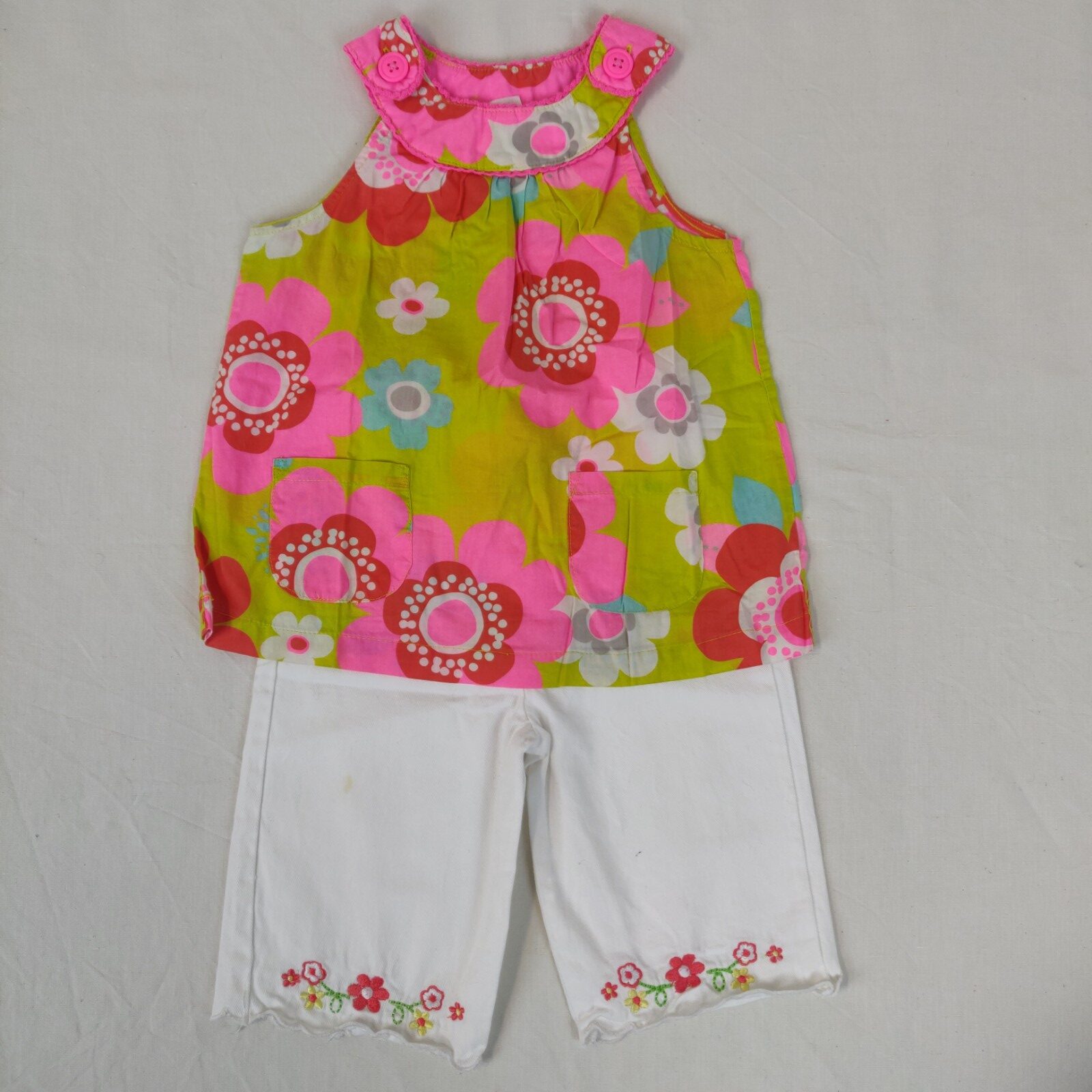 Autres commentaires : Robe à bretelles s’attachant avec un bouton – jaune-vert à motifs floraux multicolores. 2 poches centrales. Un pantalon blanc avec motifs floraux brodés au niveau des chevilles offert. Taille élastique. Tâche marron au niveau de la jambe droite.