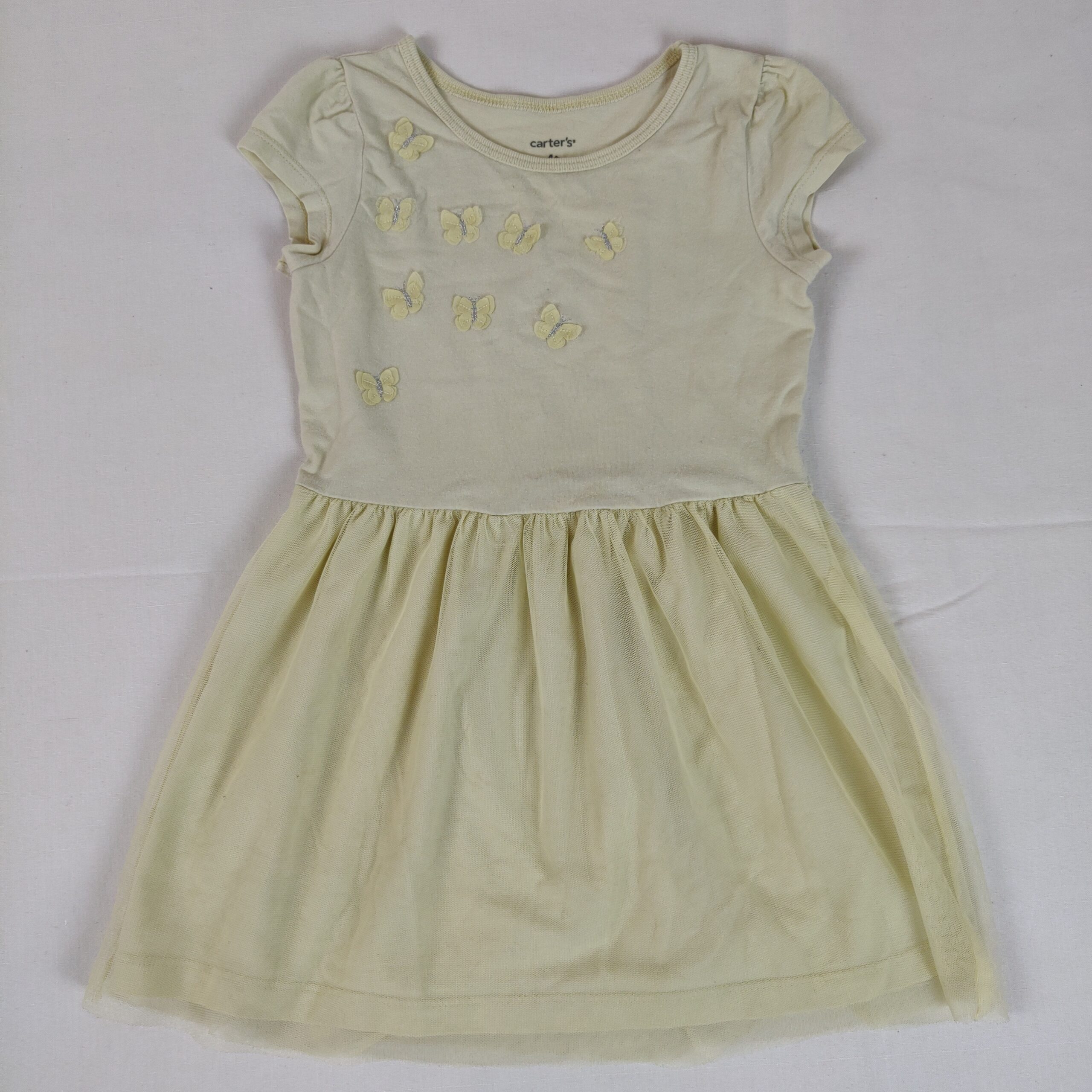 Autres commentaires : 5% élasthanne. Robe manches courtes, col rond, jaune paille. Petits papillons brodés jaunes et argents sur le torse, jupe en tulle.