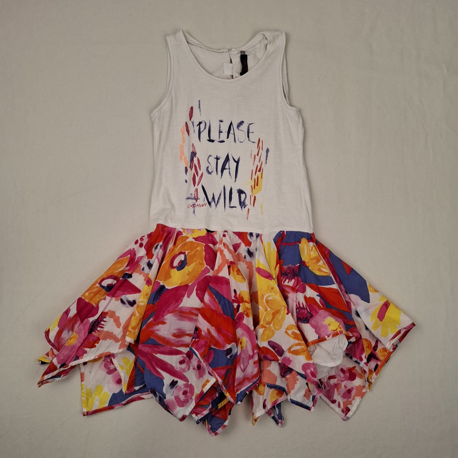 Autres commentaires : 3% élasthanne. Robe sans manches, blanche avec devant inscription « Please stay wild » en violet avec traces autour multicolores, partie jupe en mouchoir, à fleurs très colorées avec doublure blanche 100% coton.