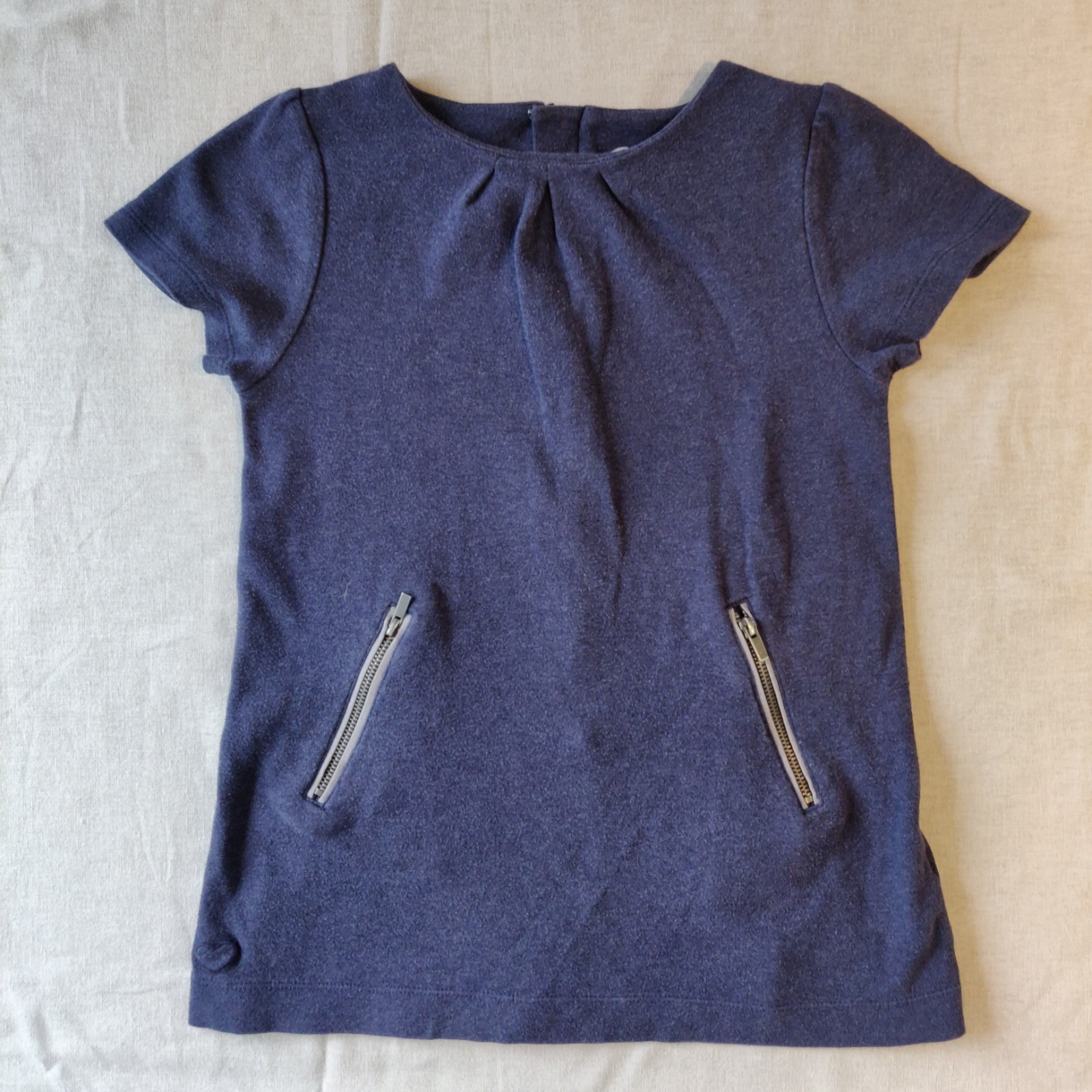 Autres commentaires : Robe courte bleue un peu grisée (possible que ce soit dû à l’usage, niveau réduit à Fraise au cas où) à manches courtes, forme trapèze, fermeture zippée au dos, deux poches zip à l’avant.